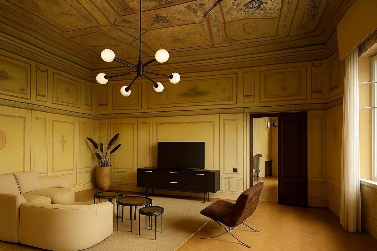 Set on the noble first floor of one of the most prestigious historic buildings in Lucca's city center, the apartment is accessed through an elegant entrance door, a loggia with columns, and beautifully preserved historic staircases. Currently registered as an office (A/10), it will be delivered completely renovated according to the approved project, with customization options available. The layout includes three bedrooms, four bathrooms, a large eat-in kitchen with direct access to the private terrace, a refined dining area, a spacious living room in the frescoed section, a study, laundry room, and optimized service spaces, all enhanced by high ceilings and original architectural details.