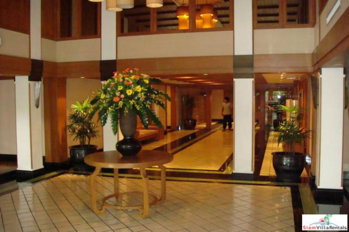 A one bedroom, two bath condo is for rent in Langsuan Ville. This building is a high-rise luxury condominium and located near Chidlom Centra, Villa Supermarket and Lumpini Park in the heart of Bangkok. There are many unique multinational restaurants and shops in the area located equally from both the Silom and Sukhumvit area. And convenient transportation, close to BTS Ratchadamri station.This furnished and air conditioned unit is located on the 12th Floor and is a large 121.18 sqm. Included is a living room, dining room, fully equipped Western kitchen and modern baths with glass showers.