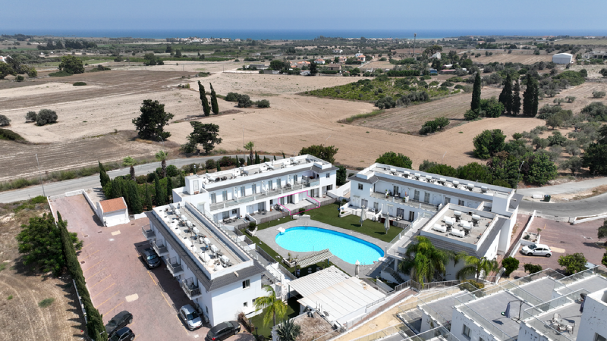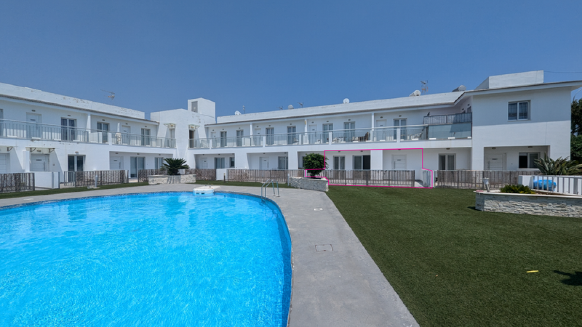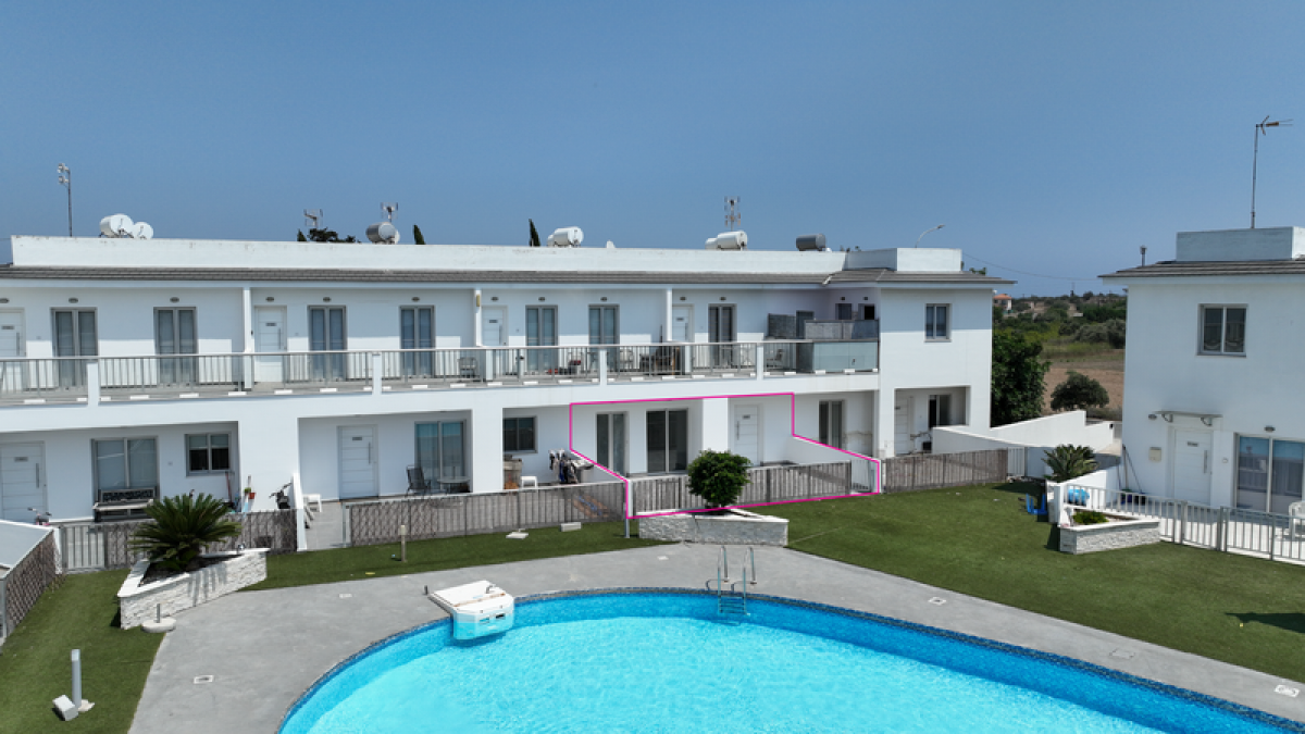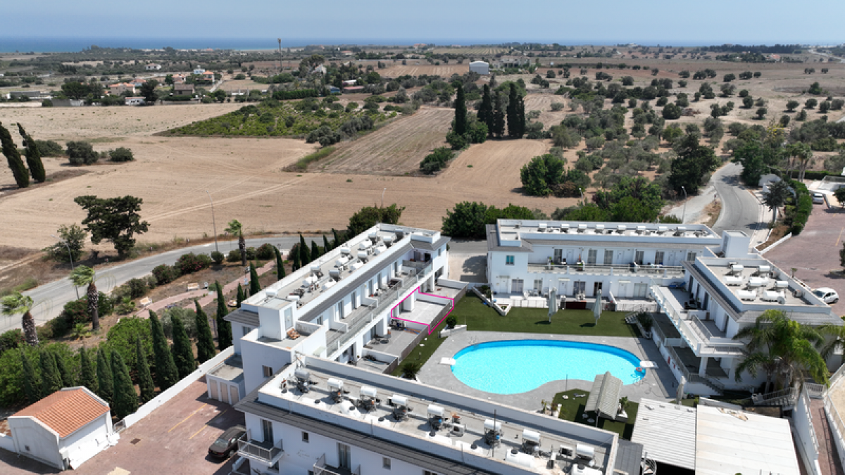 Ground floor apartment two bedroom apartment (No.3 on Block F) located in Mazotos, Larnaca.The apartment has a pool view and is comprised of an open plan living room / kitchen / dining area, 2 bedrooms (one of which is an en-suite bathroom), a main bathroom, and an uncovered veranda at the front (entrance).