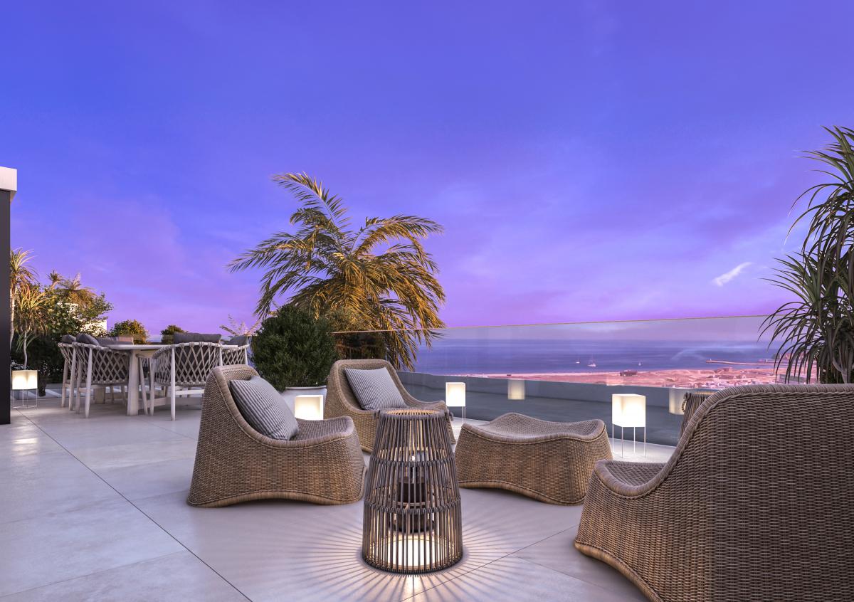 The top floor apartment benefit from a spacious lounge roof terrace equipped with a built-in E-pool.