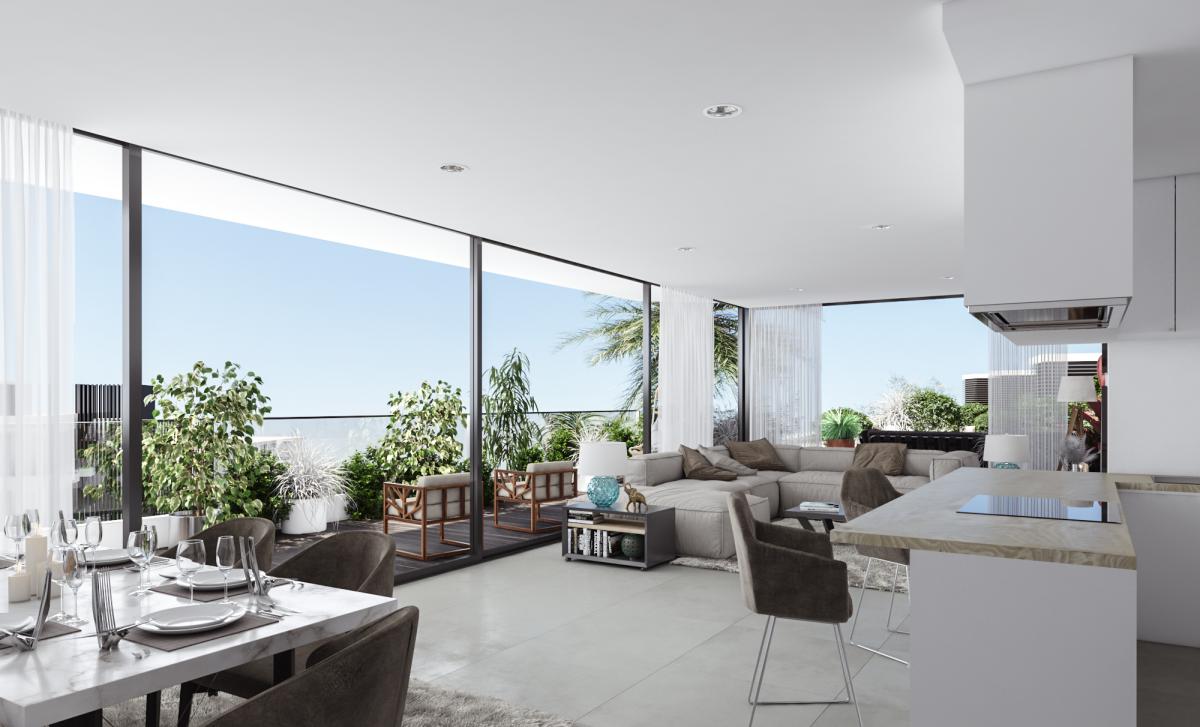 As you enter the apartments, you are met with a fabulous open plan living, kitchen dining area, leading onto a spacious terrace, that emphasizes indoor-outdoor living. The kitchen is fully equipped with integrated high-end appliances and offers a perfect space for entertaining, or having meals with all of the family.