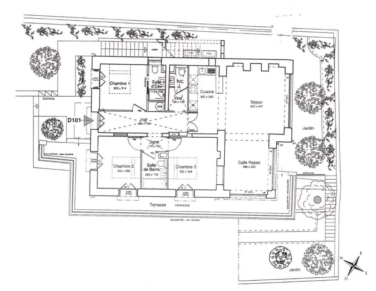 it features a bright living room with a fully equipped open-plan kitchen, all opening onto a south-facing terrace and garden, as well as three beautiful bedrooms, each with access to a terrace, and two bathrooms. Elegant private garden planted with fruit trees. Double garage.