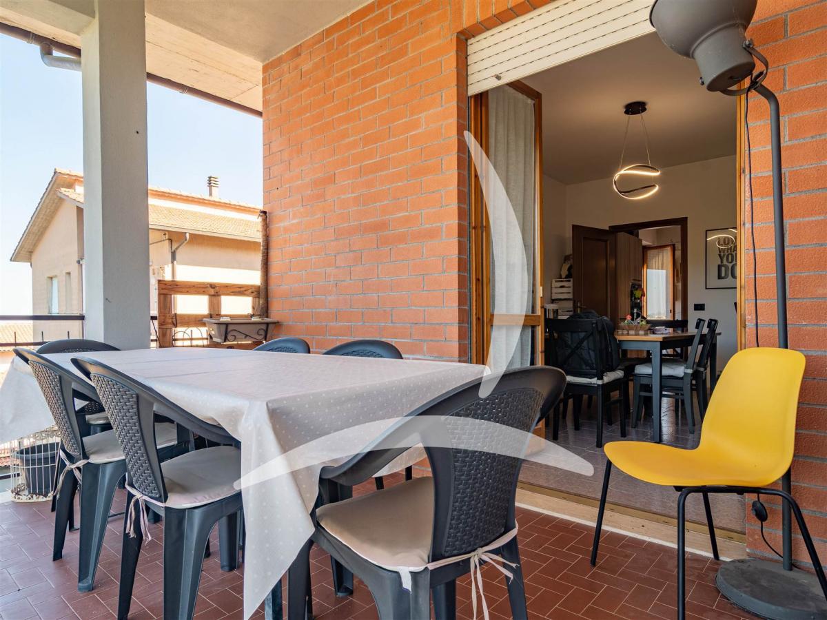 On the upper floor, accessed by a private staircase, a bright entrance-living room opens onto a habitable balcony, perfect for relaxation. The dining area, also with balcony, is ideal for al-fresco meals, while the kitchen benefits from a third balcony and abundant natural light. The sleeping wing includes two spacious double bedrooms, each with its own balcony, and two finely finished bathrooms (one windowed). A storage closet and attic space provide additional flexibility for storage or a small home office.