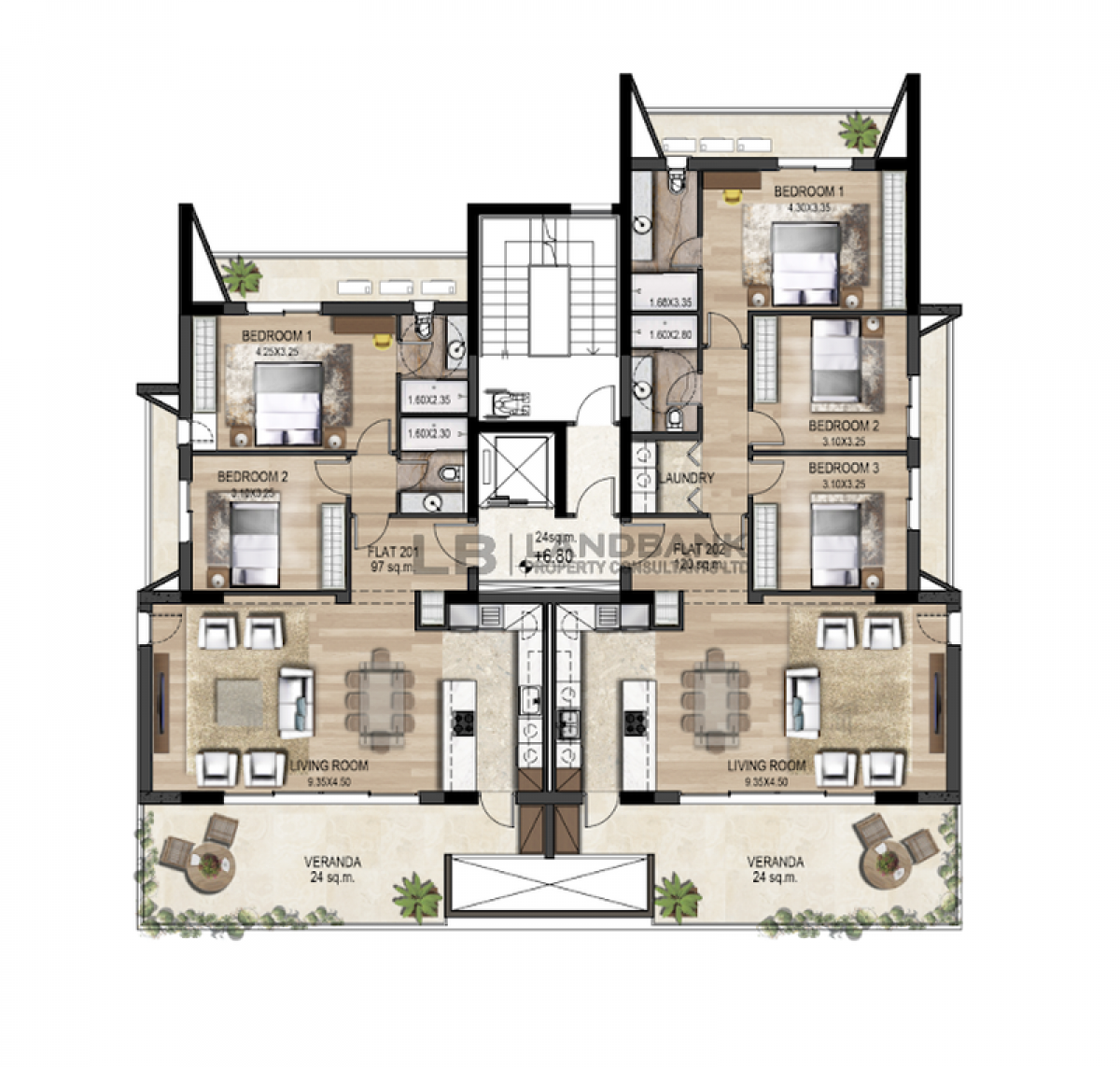 The apartment boasts generously covered areas, ensuring a spacious and comfortable living experience,offering 97sqm of internal area plus 27sqm of covered verandas.