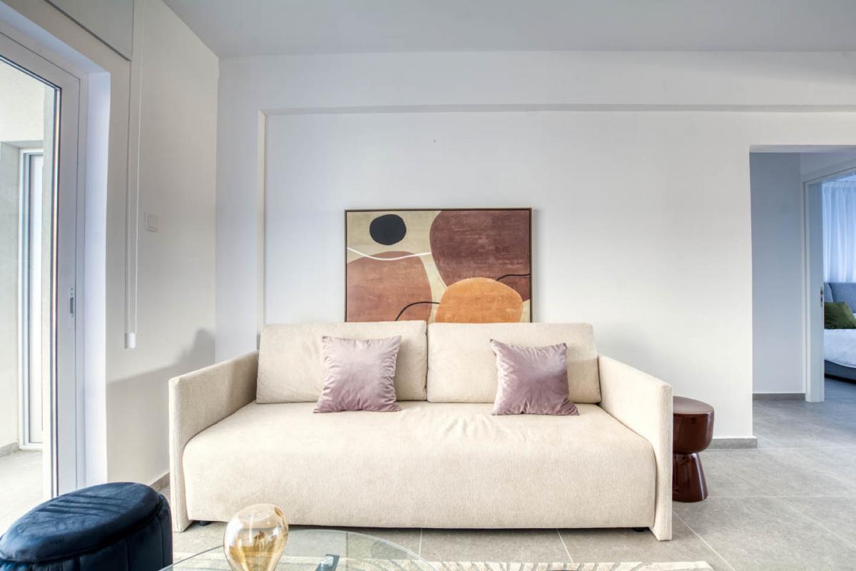 This unique ground-floor apartment immediately captivates with its harmony of space and light. As you step inside, the first thing that catches your eye is the stunning combination of soft neutral shades and natural wood accents, creating a sense of openness and purity. The open-plan living room welcomes you with exquisite decor—an elegant cream sofa adorned with lavender-toned decorative pillows sits opposite a stylish glossy coffee table. Above the sofa, an impressive abstract artwork in warm terracotta and ochre hues adds depth and character to the interior.