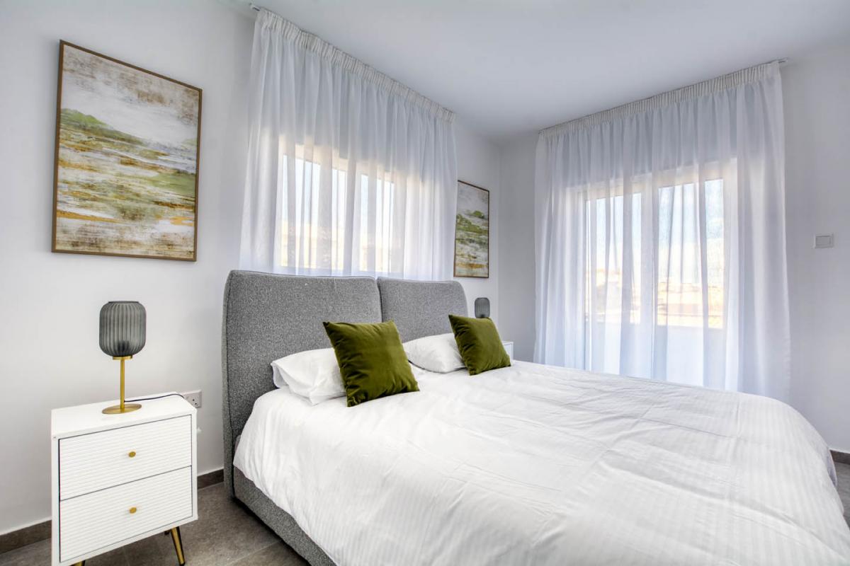 The sleeping quarters serve as a true retreat from the hustle and bustle of everyday life. The master bedroom is designed in soothing neutral tones, with rich green velvet accent pillows adding a touch of sophistication. A spacious bed with a soft gray upholstered headboard invites restful sleep, while crisp white linens enhance the feeling of freshness and tranquility. Sheer curtains gently diffuse natural light, preserving an atmosphere of privacy. Floor-to-ceiling built-in wardrobes with glossy facades provide ample storage while maintaining a clean, uncluttered look.