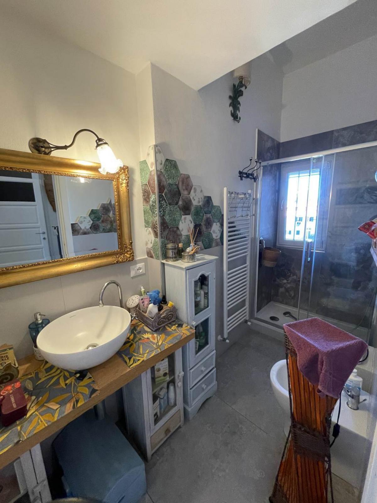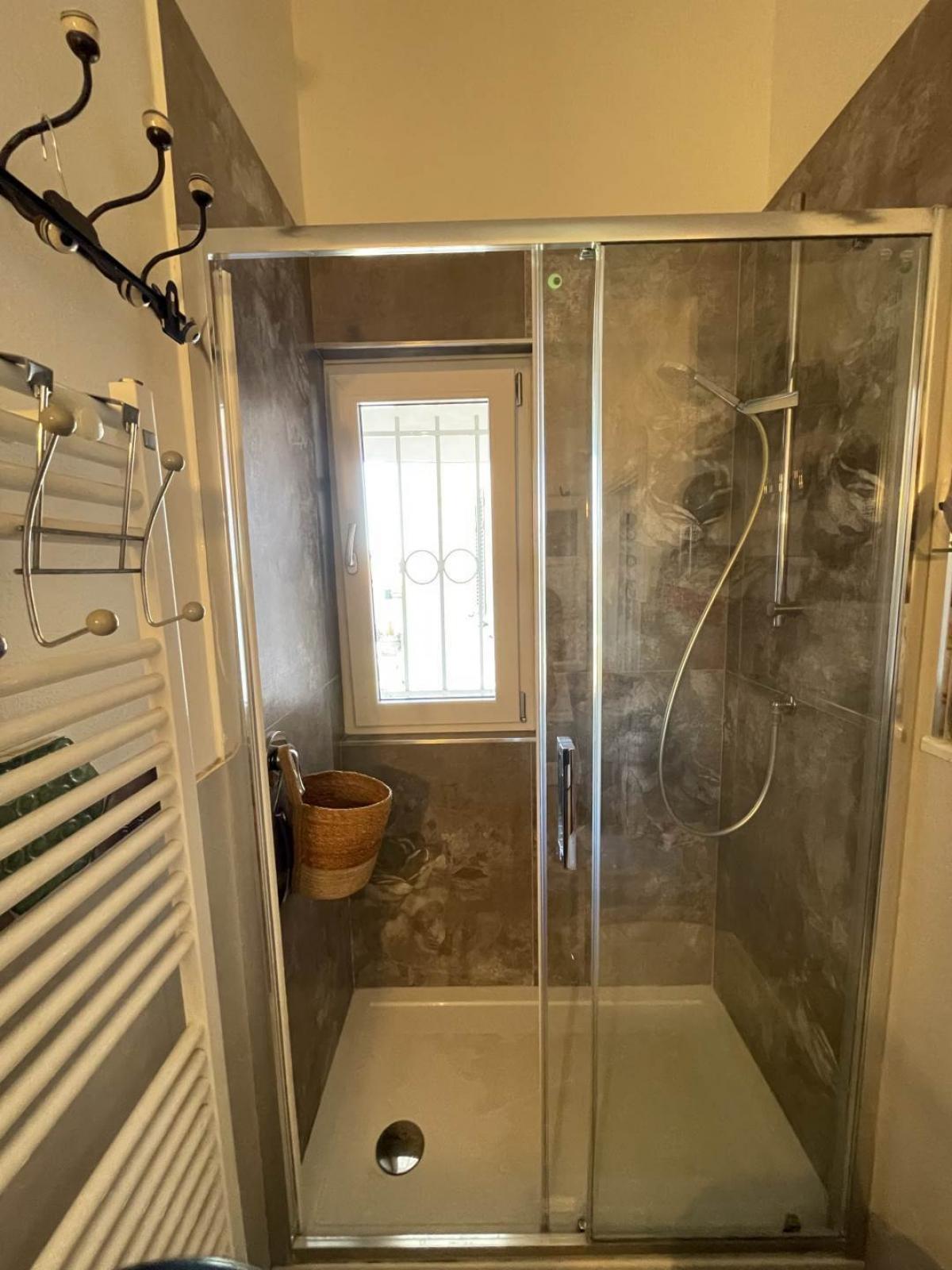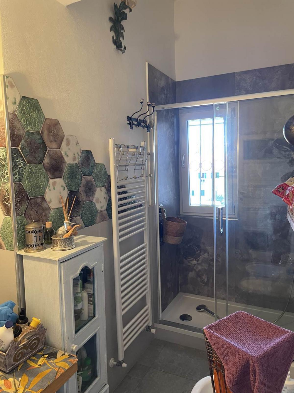The master bedroom includes an en suite bathroom with shower and overlooks the historic center of Piombino, while a second bathroom with shower serves the living area.