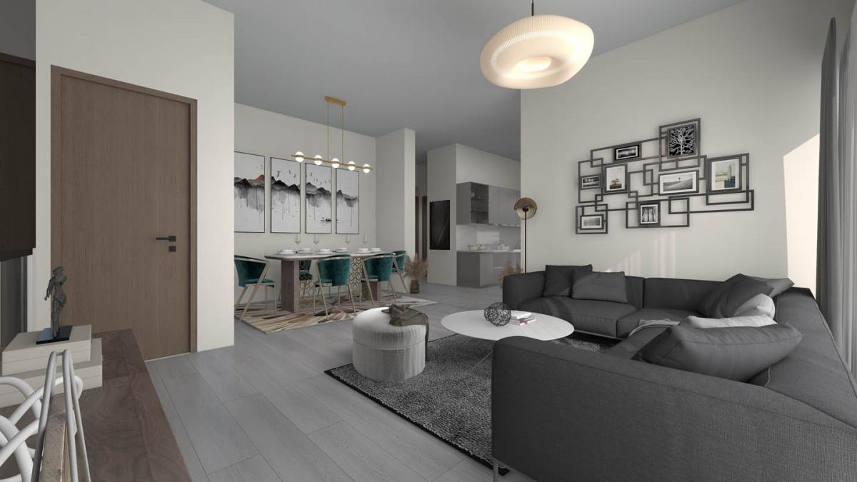 The apartment is one of 6 properties in a low-rise building currently under construction. The covered area of the apartment is 80 square meters. A covered balcony with views of the countryside expands the living space up to 120 square meters of usable area.