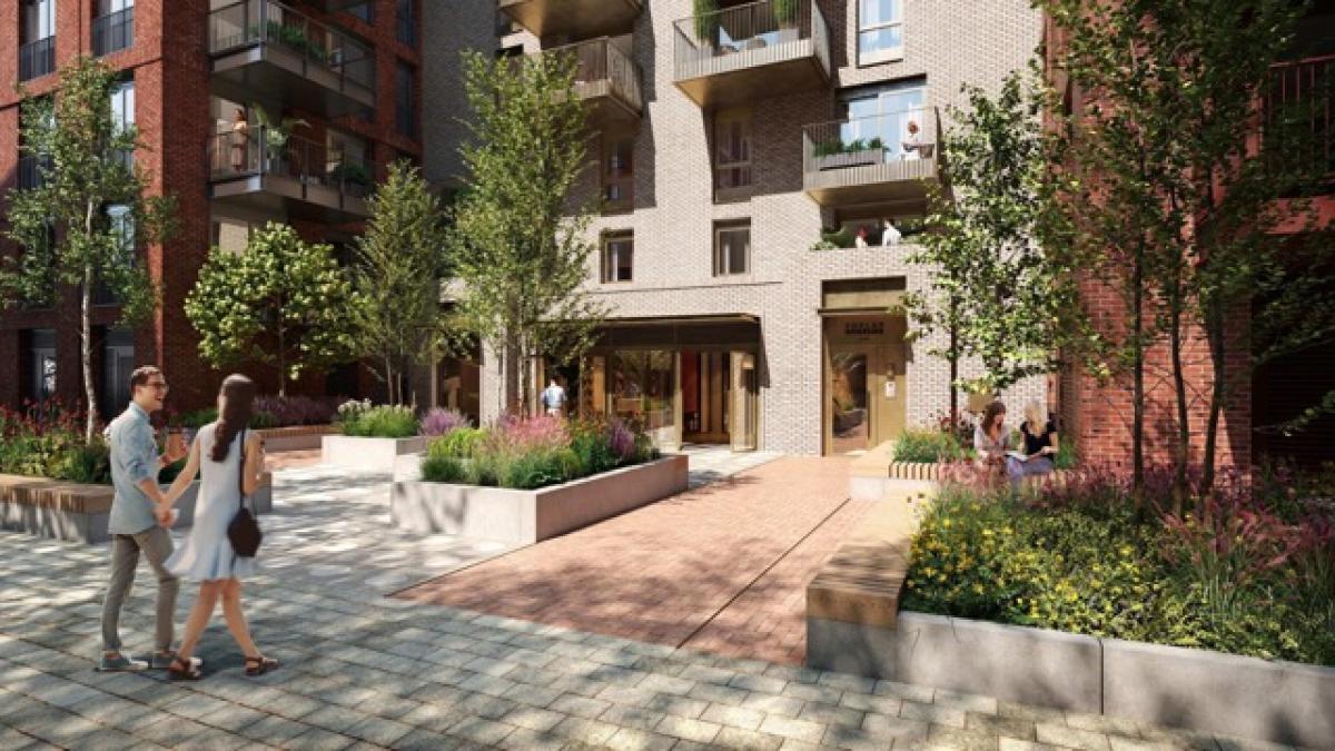 The area is set to become a unique East London neighborhood, complete with a public piazza for community events, an on-site Sainsbury's grocery store, and a variety of restaurants and cafes.