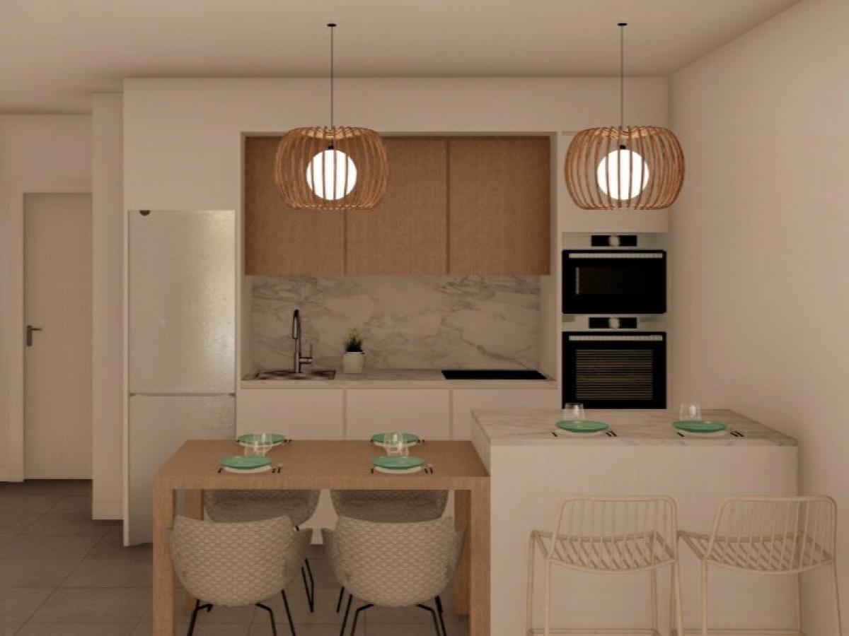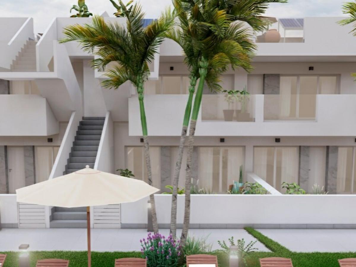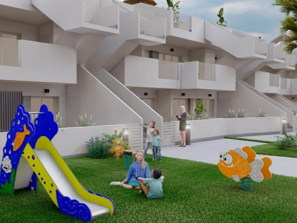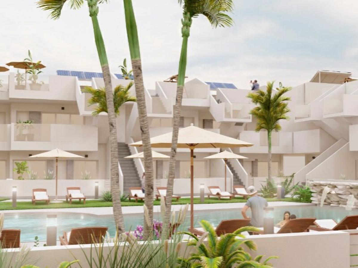 3 bed option from 223.000 eurosGated resort with options for 2/3 bedrooms and 2 bathrooms, terrace on the first floor and solarium for the upper floor. The interiors, elegant and functional with high quality flooring, fully fitted kitchens including electrical appliances. The bathrooms have a vanity unit with washbasin and light. The bedrooms include lined wardrobes with drawers and sliding doors and each property has pre-installation for ducted air conditioning.