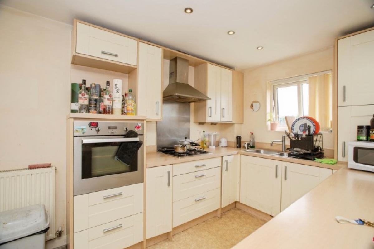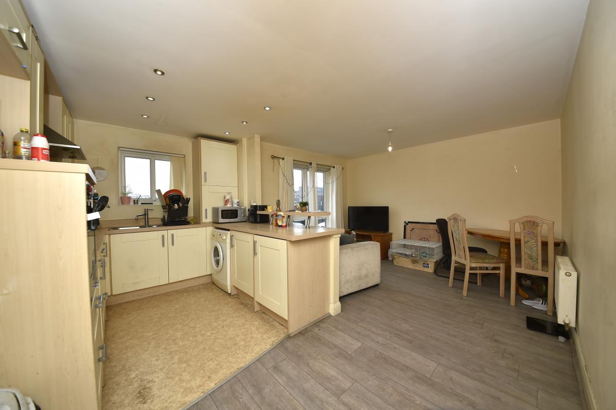The main living area benefits from a dual-aspect layout with a wide window allowing plenty of natural light. The fitted kitchen includes ample cabinetry and the breakfast bar divides the kitchen and lounge area, creating a sociable open-plan space ideal for relaxed living or entertaining. The room retains a modern yet functional character, though some cosmetic improvement may be desired.
