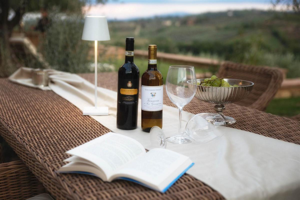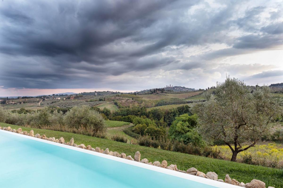 For sale, a luxurious stone property, recently renovated with great attention to local traditions and materials, located in a stunning panoramic position in San Gimignano. Situated on a hill with views of the famous medieval towers, this exclusive residence is surrounded by 1.5 hectares of land. The swimming pool, the highlight of the complex, is set in a sunny position and offers spectacular views of the town of San Gimignano and the surrounding countryside, also beautifully illuminated at night.