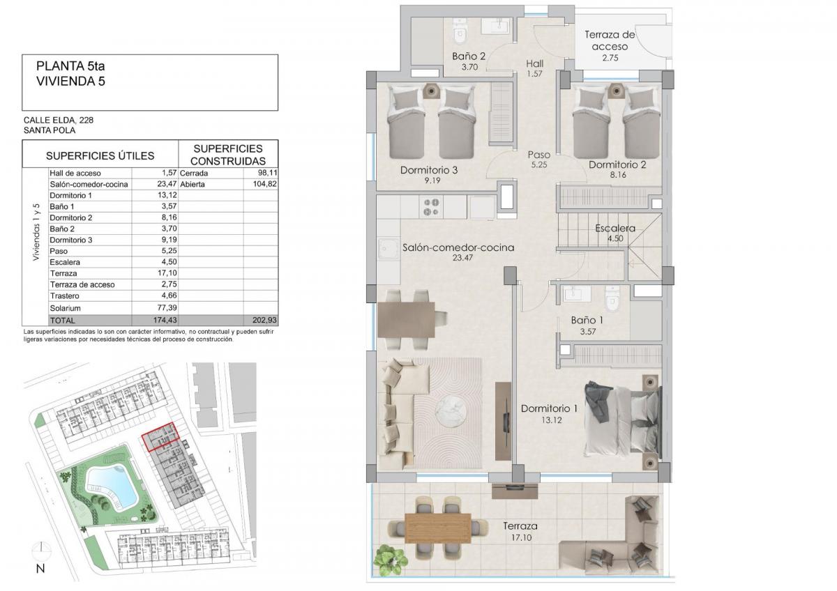 Modern gated residential complex comprising three blocks of apartmwnts with large landscaped communal areas including a swimming pool with water beds, children's playground, pergola and bicycle parking.The residential has 3 and two bedrooms apartments, both types include 2 full bathrooms, open-plan kitchen with living room, fitted wardrobes, terrace, parking space.They have a common garden, swimming pool with beach-type entrance, equipped with showers and a large wooden pergola. it has landscaped areas with palm trees and vegetation, all of which are illuminated. in the central part of the pool there is a shallower area where the water beds are located. The municipality of Santa Pola is located on the popular Costa Blanca on the Mediterranean, South of Alicante and in the Bajo Vinalopo region.The city is in an enviable geographical position, surrounded by natural landscapes and with a special microclimate, which offers a mild climate all year round. its urban center is bounded by the Castle Fortress and the port to the East and west, and is bordered by the Santa Pola Salinas Natural Park and the Sierra and Cabo de Santa Pola, an ancient reef today characterized by its reef leafy pine trees.Santa Pola located 21 km. from Alicante, the provincial capital with excellent infrastructure and 15 km. away from the international Airport Elche-Alicante.