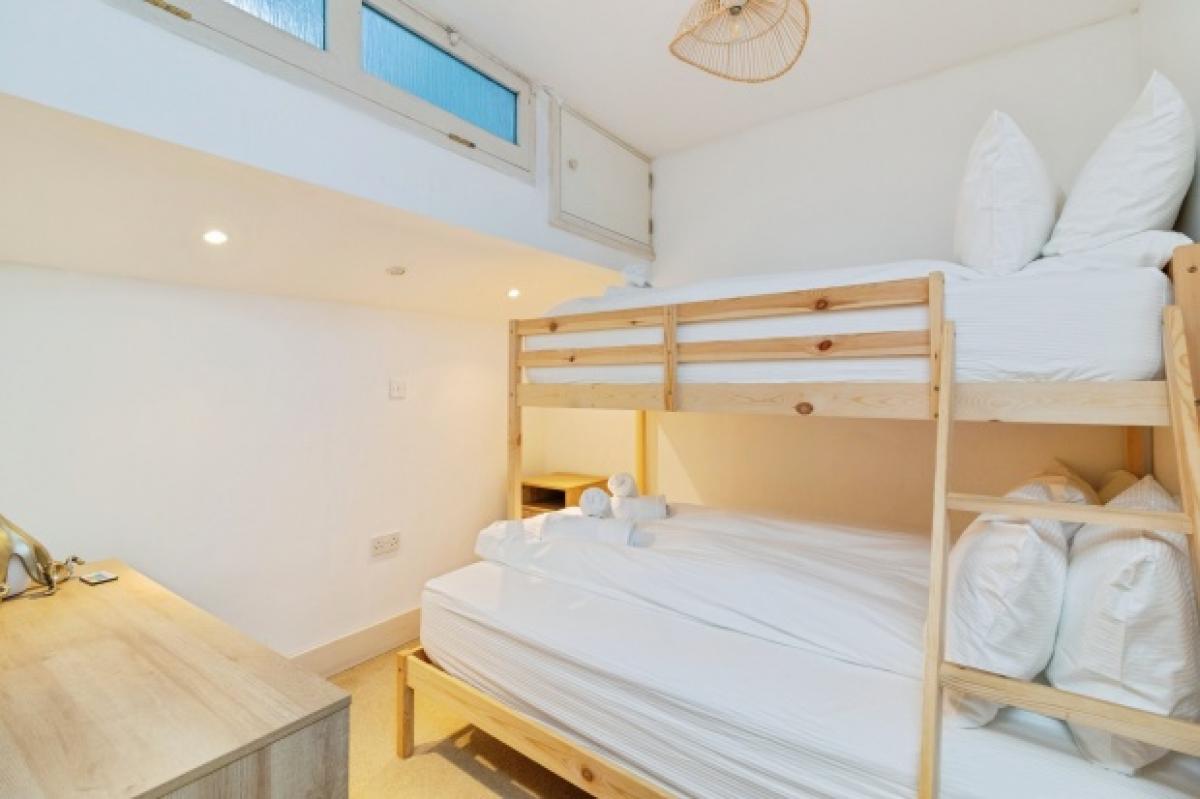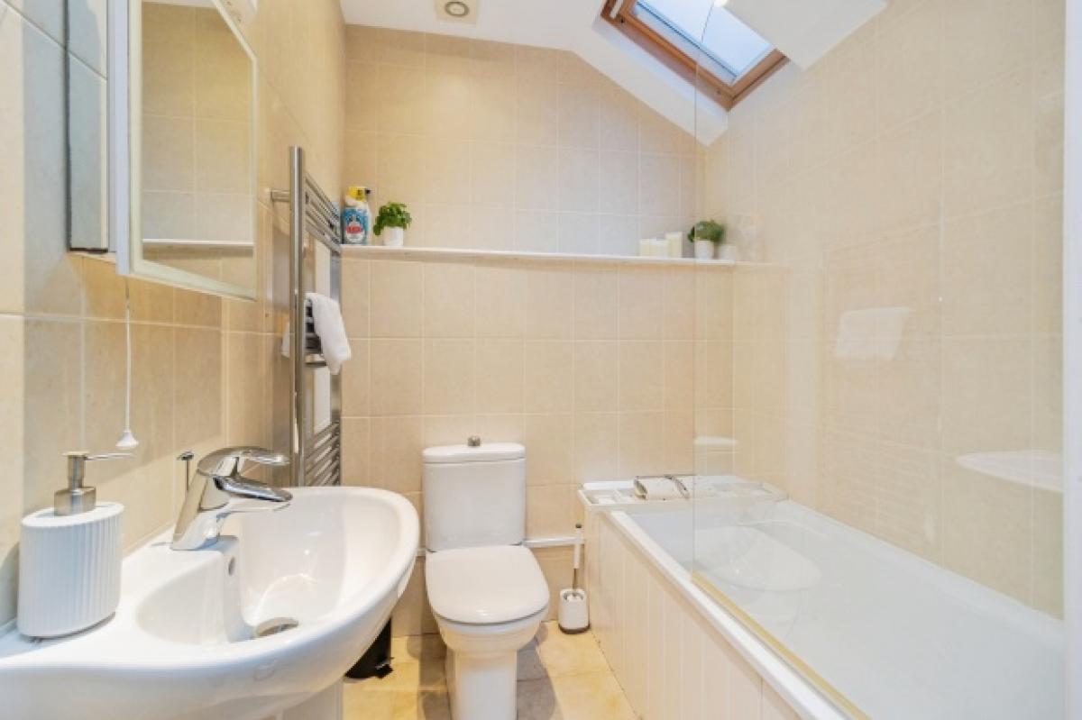 There are two well-proportioned bedrooms, both presented in neutral decor to maximise light and flexibility. The main double bedroom benefits from a wide bay-style window, creating a bright and calming retreat. The second bedroom is ideal as a guest room, children's room or dedicated home office, supporting a range of lifestyle or letting requirements. The contemporary bathroom is finished with a white suite, over-bath shower, tiled walls and a skylight, delivering a fresh, modern feel.