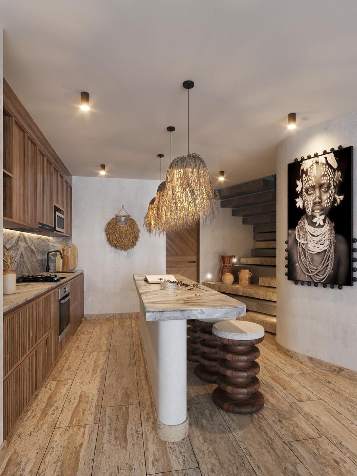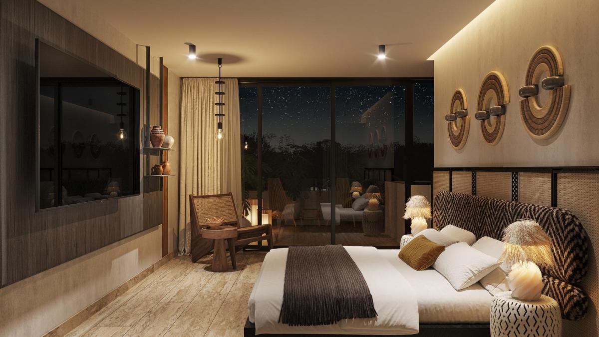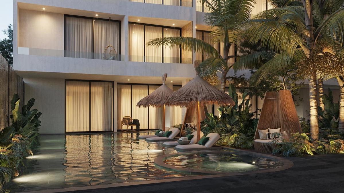 This exclusive development in Tulum offers a selection of 52 residences including studios, 1 and 2-bedroom apartments, and luxurious 3-bedroom penthouses with private pools. Each unit has been designed with premium marble and wood finishes, expansive windows, and terraces that maximize natural light and connection with the surroundings. Some units feature a private jacuzzi and a dual lock-off system, providing flexibility for personal use or vacation rental. The interior spaces combine fluid geometries and warm textures, creating environments that invite relaxation and comfort.Residents enjoy access to a swimming pool with a swim lane and swim-up access, a rooftop with a pool, solarium, jacuzzi, fire pit, cinema, and a 100 m2 gym. The development also includes commercial spaces, perfect for those seeking convenience without leaving the complex. These amenities have been carefully selected to create a lifestyle where luxury and well-being merge, allowing residents to create unforgettable memories in a paradisiacal setting.