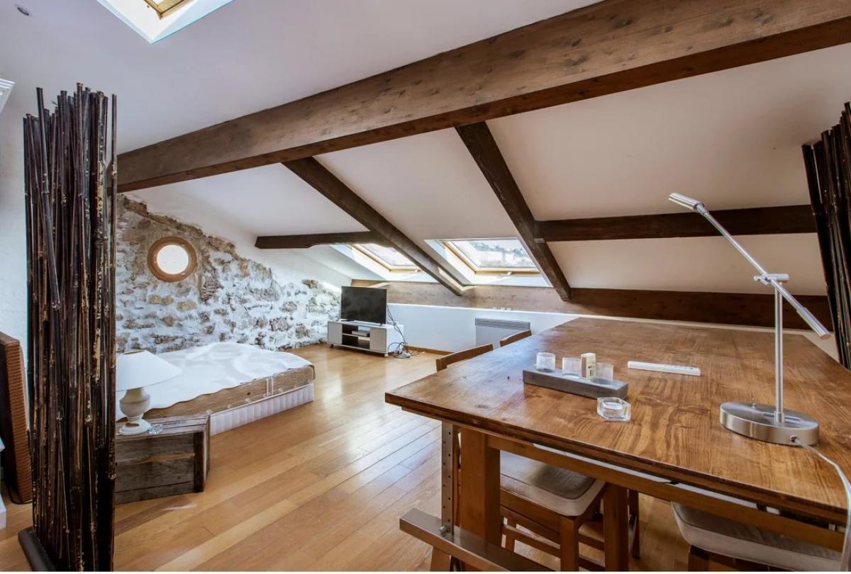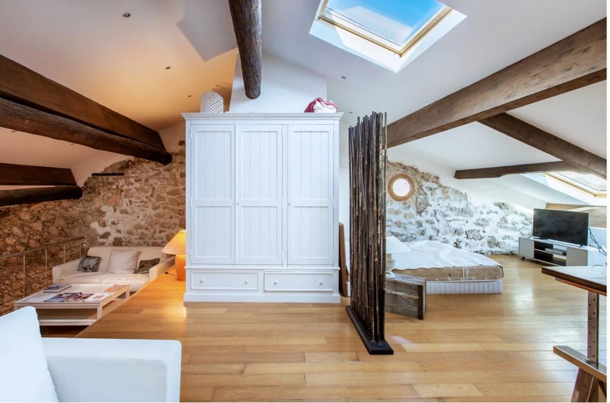 Lots of charm for this superb 100 m2 loft-style apartment with high ceilings, located on the top floor of a typical building in the old town of Villefranche-sur-mer. it includes a large living / dining room with an equipped American kitchen, and, on the mezzanine, a small living room and a large bedroom with a shower room. Bright and calm, it also offers a splendid sea view from the two large skylights.