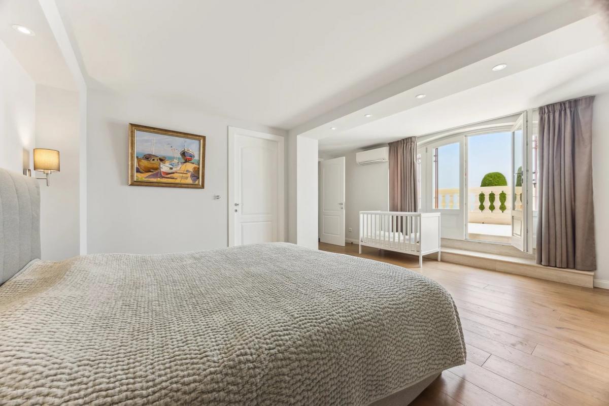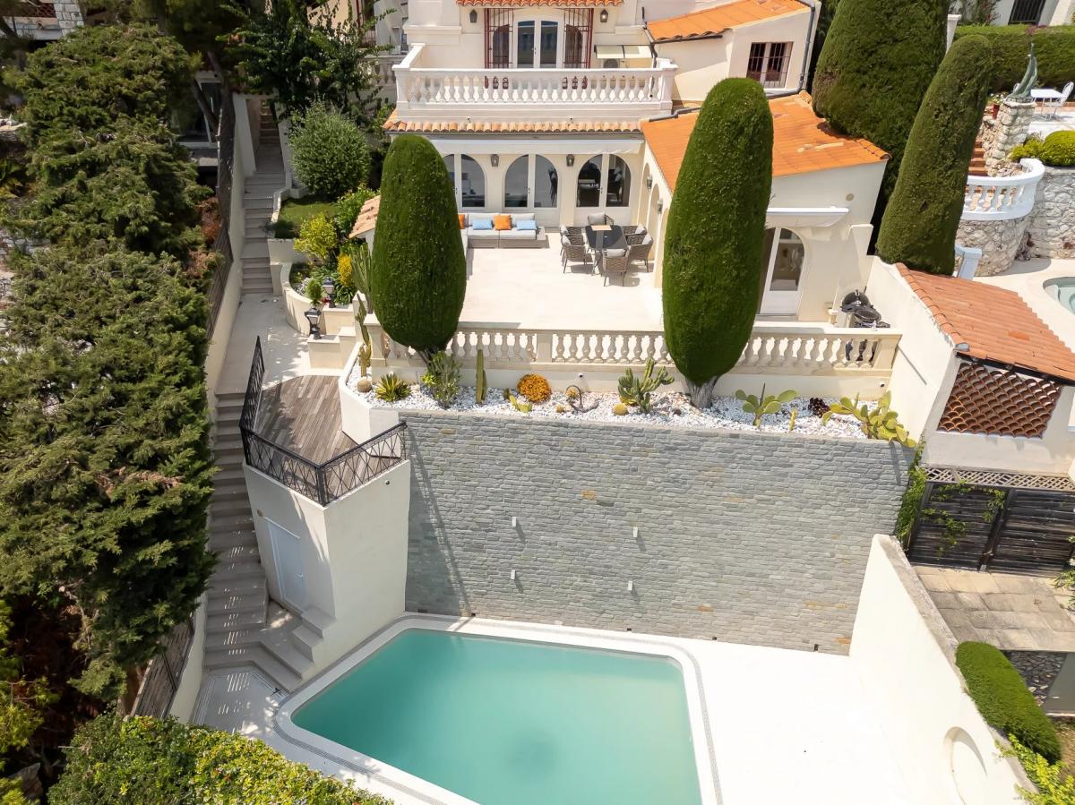RARE! in a small Art Deco building, beautiful duplex of 190 sqm, with its own and private swimming pool and a panoramic sea view over the Bay of Villefranche and Cap Ferrat, facing south. At the ground floor, the interiors offer 3 bedrooms en suite, the master bedroom opening on a beautiful terrace, at the garden floor, a large living room, a dining room, a kitchen an a laundry, all opening onto a double terrace over 100 sqm. Closed garage and a car parking space.