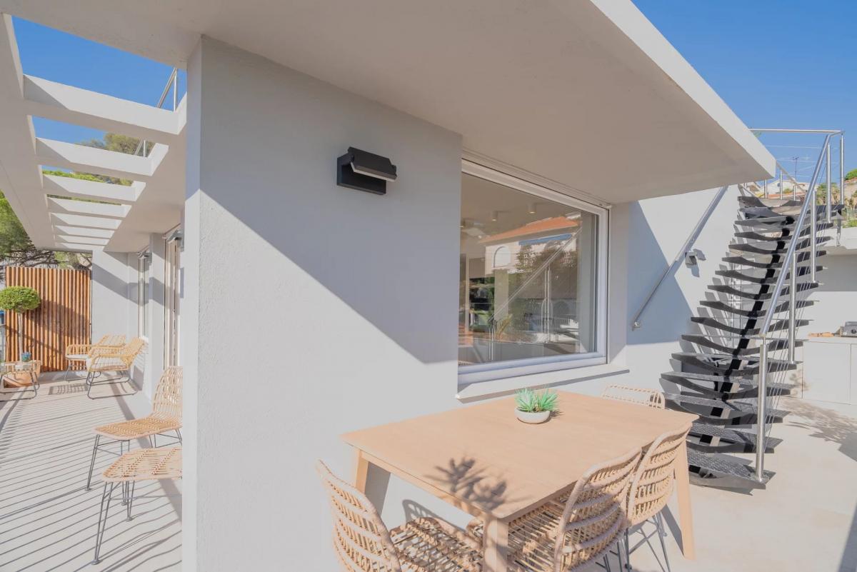 With its independent entrance, access is through a private patio of discreet charm, leading to a vast reception room bathed in natural light and featuring a sleek open-plan kitchen. From here, a generous terrace facing the sea invites you to pause and admire the view.