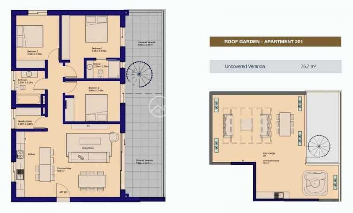 This three bedroom apartment has 113m2 internal covered area, 15m2 of covered veranda, 6m2 of uncovered veranda and a rof garden of 75m2.
