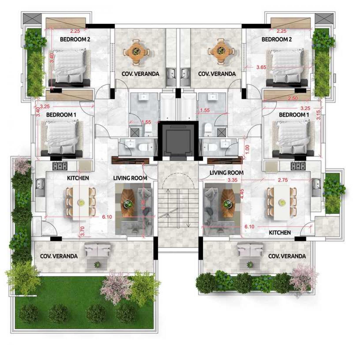 * Spacious Layouts: Each apartment boasts 78 sqm of covered area, complemented by 22 sqm of covered verandas, 7 sqm of uncovered verandas, and 3 sqm of storage space.