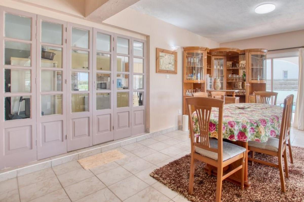 The exterior of the property boasts an extensive L-shaped covered veranda, a private swimming pool with outdoor shower, and ample space for outdoor dining, relaxation, and enjoying the warm Cyprus climate. Additional features include a wooden storage shed, BBQ area, gated driveway, private garage, and a front veranda surrounded by mature gardens.