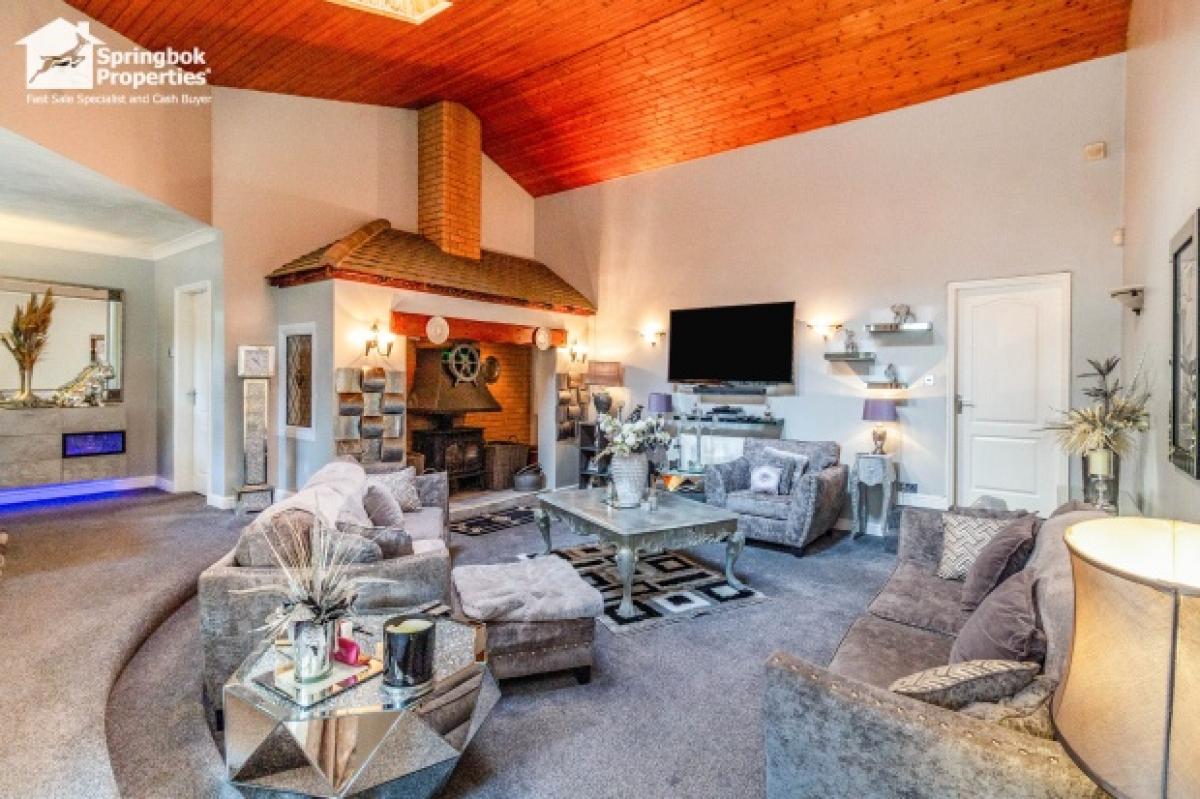 * Expansive lounge with vaulted ceiling and multi-fuel stove