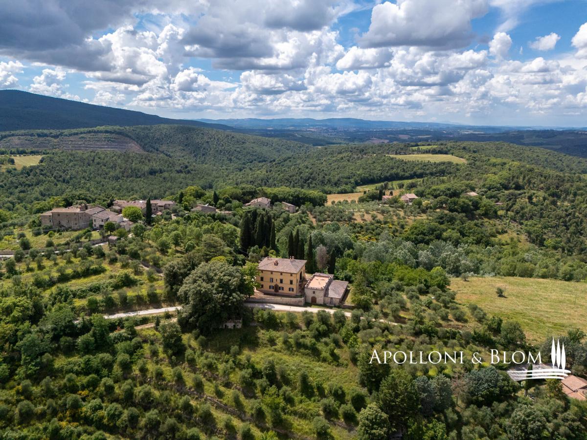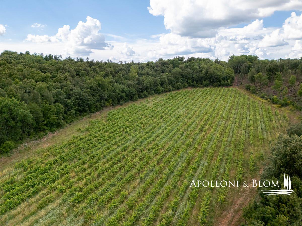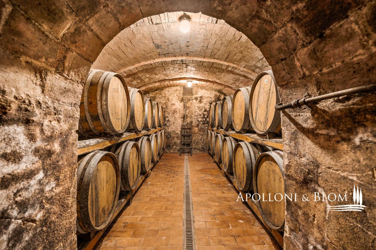 Supreme opportunity in Chianti near Siena, for sale over 500-acre authentic Italian Eighteenth century estate with vineyards and cantina. Among the Chianti hills, at 350 meters above sea level, halfway between the magnificent Gothic city of Siena and the medieval castle of Monteriggioni, just 40 minutes south of Florence, Palazzetto Manor dominates an enchanting scenery over its 205 hectares/506 acres of private land accounting its first vineyards planted back in 1970. Built on the foundations of a medieval fortress, this classic 18th-century villa extends over three floors overlooking the park; the stone decorations enhance its elegant character, typical of the country residences of Sienese aristocratic families. The interior can accommodate either a private residence or a boutique hotel up to 8-10 bedrooms, all boasting natural light and views over the park and the surrounding with villages, woods and isolated farmhouses. The entrance foyer and main staircase are suitable for the installation of a modern elevator. The main hall on the first floor features a full-height arched window, a fireplace and access to a balcony and bridged walkway leading to a great terrace. Here a brick balustrade frames the magnificent open landscape. Recent renovations included the complete re-roofing, plastering of the facades, a pellet boiler heating system, parquet flooring and full decoration of two elegant bathrooms on the first floor. The large terrace is the rooftop of the second building dedicated to the winery facility, with stunning brick vaulted ceilings, and producing some 30,000 bottles of Chianti Colli Senesi DOCG and Toscana IGT a year, sold both in the domestic and foreign markets. The vineyards, in conversion to organic with certification expected in 2026, cover approximately 14 hectares/34.5 acres and are planted mainly with Sangiovese, Canaiolo, and vines of Cabernet Sauvignon, Merlot and Syrah. From the cantina ground floor, a stone-walled tunnel, built in the first half of the 1900s, provides a very impressive connection to a cave and to an internal staircase leading directly to the main foyer of the house. It is possible to transform the cellar building into living quarters and create a new separate building entirely dedicated to the farm and winery facilities. Part of the arable land can also be converted to vineyards to increase production. With its strategic location on the outskirts of the city of Siena, elegant historical features with over three hundred years of history and a long passion for Tuscan red wines, Palazzetto Mansion offers a great opportunity to become an exclusive boutique wine resort or a fine and luxurious private residence to enjoy with family and friends. PROPERTY Ref: SIE3021 Location: Monteriggioni, Province: Siena, Region: Tuscany Type: 205-hectares/506 acres farm cultivating vineyards and olive groves, featuring a 800 sq m/8611 sq ft 18th century three story villa, a 650 sq m/6996 sq ft stone building with roof terrace dedicated to wine making facility, garage and annexes Year of renovation: facades and roof completed 2022 Land/Garden: 205 hectares including 60 ha/148.2 acres of arable land, 125 ha/308 acres of forest, 14 ha/34.5 acres of vineyards, 1.6 ha/4 acres of olive groves, and over 4 ha/10 acres of pasture and rural areas Swimming pool: option available to build it either for private use (5x10mt) or tourism hospitality (7x14mt) Utilities: Fixed telephone network: available Internet/Wi-Fi: available Heating: methane + pellet + fireplaces Water: mains city supply + private well Electricity: available Waterwaste: Imhoff tank Distance from services: 5km Distance from the main airports: Firenze 70km, Pisa 95km Gravel road: 300 mt Manor Villa Basement Floor: vaulted cave with access to tunnel Ground Floor: entrance hall with foyer and stairs to the various floors, living room, study, staff rooms, pantry, kitchen, butler and back staircase, technical room with pellet boiler and storage room with easy outdoor access First Floor: double living room with fireplace and access to a balcony, a bridge and a great panoramic terrace, eat-in kitchen, 3 double bedrooms, 1 family bathroom, 1 bedroom with en suite bathroom Second Floor: 10 rooms to be converted in further bedrooms and bathrooms Stone building Cantina Ground Floor: 2 rooms with production areas, steel tanks and wooden barrels, a tunnel and access to the villa cave First Floor: rooms for storage and warehouse use with three entrances directly from the outdoor DETAILS ON WINE PRODUCTION - Current vineyard surface: 14 hectares/34.5 acres - Appellation: Chianti dei Colli Senesi DOCG, IGT Toscana - Varieties: Sangiovese, Canaiolo, Merlot, Cabernet Sauvignon, Syrah - Average altitude: 250 – 330 m asl - Soil: - Planting distance: 2.50×0.90 m - Years of planting: 1974 – 2000 - 2003 – 2005 - Training: pruned-spur cordon (4,000 vines/ha) - Yearly production: up to 30,000 bottles - Wine produced: Chianti dei Colli Senesi DOCG, IGT Toscana - Wine making Facility: 650 sq m/6996 sq ft two-story stone building with roof terrace- terrace