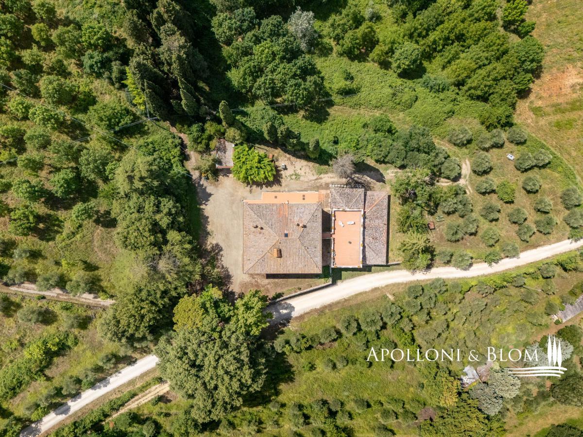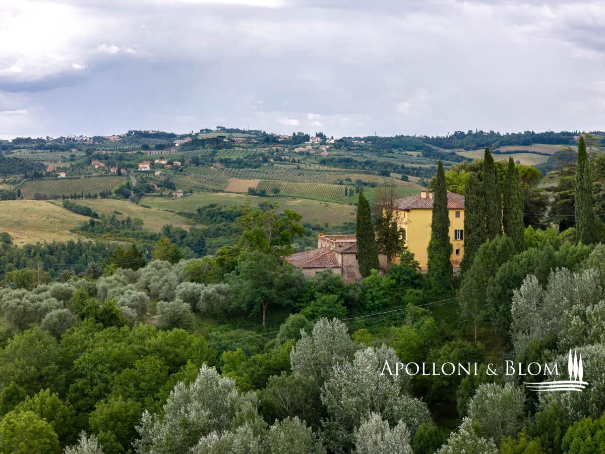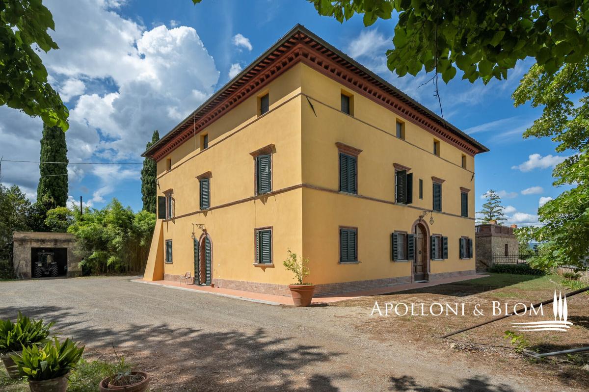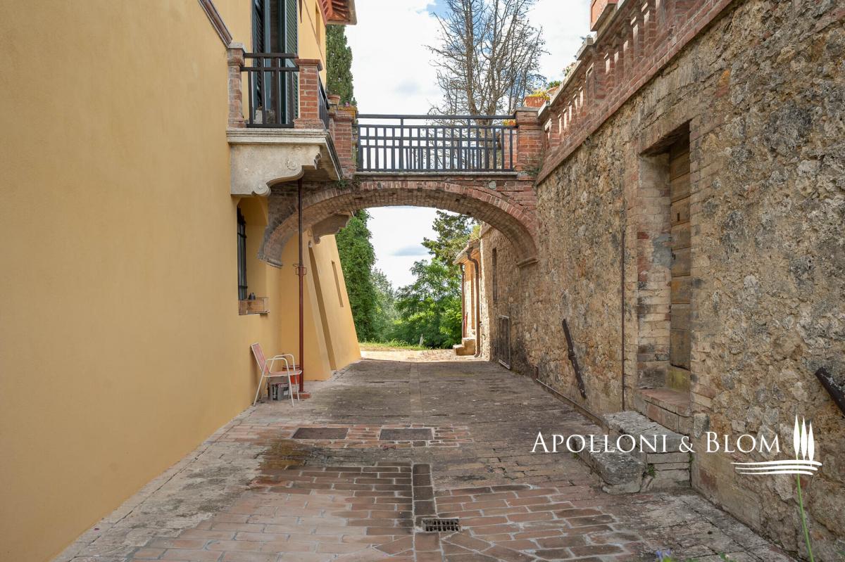 Supreme opportunity in Chianti near Siena, for sale over 500-acre authentic Italian Eighteenth century estate with vineyards and cantina. Among the Chianti hills, at 350 meters above sea level, halfway between the magnificent Gothic city of Siena and the medieval castle of Monteriggioni, just 40 minutes south of Florence, Palazzetto Manor dominates an enchanting scenery over its 205 hectares/506 acres of private land accounting its first vineyards planted back in 1970. Built on the foundations of a medieval fortress, this classic 18th-century villa extends over three floors overlooking the park; the stone decorations enhance its elegant character, typical of the country residences of Sienese aristocratic families. The interior can accommodate either a private residence or a boutique hotel up to 8-10 bedrooms, all boasting natural light and views over the park and the surrounding with villages, woods and isolated farmhouses. The entrance foyer and main staircase are suitable for the installation of a modern elevator. The main hall on the first floor features a full-height arched window, a fireplace and access to a balcony and bridged walkway leading to a great terrace. Here a brick balustrade frames the magnificent open landscape. Recent renovations included the complete re-roofing, plastering of the facades, a pellet boiler heating system, parquet flooring and full decoration of two elegant bathrooms on the first floor. The large terrace is the rooftop of the second building dedicated to the winery facility, with stunning brick vaulted ceilings, and producing some 30,000 bottles of Chianti Colli Senesi DOCG and Toscana IGT a year, sold both in the domestic and foreign markets. The vineyards, in conversion to organic with certification expected in 2026, cover approximately 14 hectares/34.5 acres and are planted mainly with Sangiovese, Canaiolo, and vines of Cabernet Sauvignon, Merlot and Syrah. From the cantina ground floor, a stone-walled tunnel, built in the first half of the 1900s, provides a very impressive connection to a cave and to an internal staircase leading directly to the main foyer of the house. It is possible to transform the cellar building into living quarters and create a new separate building entirely dedicated to the farm and winery facilities. Part of the arable land can also be converted to vineyards to increase production. With its strategic location on the outskirts of the city of Siena, elegant historical features with over three hundred years of history and a long passion for Tuscan red wines, Palazzetto Mansion offers a great opportunity to become an exclusive boutique wine resort or a fine and luxurious private residence to enjoy with family and friends. PROPERTY Ref: SIE3021 Location: Monteriggioni, Province: Siena, Region: Tuscany Type: 205-hectares/506 acres farm cultivating vineyards and olive groves, featuring a 800 sq m/8611 sq ft 18th century three story villa, a 650 sq m/6996 sq ft stone building with roof terrace dedicated to wine making facility, garage and annexes Year of renovation: facades and roof completed 2022 Land/Garden: 205 hectares including 60 ha/148.2 acres of arable land, 125 ha/308 acres of forest, 14 ha/34.5 acres of vineyards, 1.6 ha/4 acres of olive groves, and over 4 ha/10 acres of pasture and rural areas Swimming pool: option available to build it either for private use (5x10mt) or tourism hospitality (7x14mt) Utilities: Fixed telephone network: available Internet/Wi-Fi: available Heating: methane + pellet + fireplaces Water: mains city supply + private well Electricity: available Waterwaste: Imhoff tank Distance from services: 5km Distance from the main airports: Firenze 70km, Pisa 95km Gravel road: 300 mt Manor Villa Basement Floor: vaulted cave with access to tunnel Ground Floor: entrance hall with foyer and stairs to the various floors, living room, study, staff rooms, pantry, kitchen, butler and back staircase, technical room with pellet boiler and storage room with easy outdoor access First Floor: double living room with fireplace and access to a balcony, a bridge and a great panoramic terrace, eat-in kitchen, 3 double bedrooms, 1 family bathroom, 1 bedroom with en suite bathroom Second Floor: 10 rooms to be converted in further bedrooms and bathrooms Stone building Cantina Ground Floor: 2 rooms with production areas, steel tanks and wooden barrels, a tunnel and access to the villa cave First Floor: rooms for storage and warehouse use with three entrances directly from the outdoor DETAILS ON WINE PRODUCTION - Current vineyard surface: 14 hectares/34.5 acres - Appellation: Chianti dei Colli Senesi DOCG, IGT Toscana - Varieties: Sangiovese, Canaiolo, Merlot, Cabernet Sauvignon, Syrah - Average altitude: 250 – 330 m asl - Soil: - Planting distance: 2.50×0.90 m - Years of planting: 1974 – 2000 - 2003 – 2005 - Training: pruned-spur cordon (4,000 vines/ha) - Yearly production: up to 30,000 bottles - Wine produced: Chianti dei Colli Senesi DOCG, IGT Toscana - Wine making Facility: 650 sq m/6996 sq ft two-story stone building with roof terrace- terrace