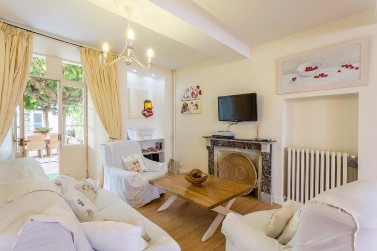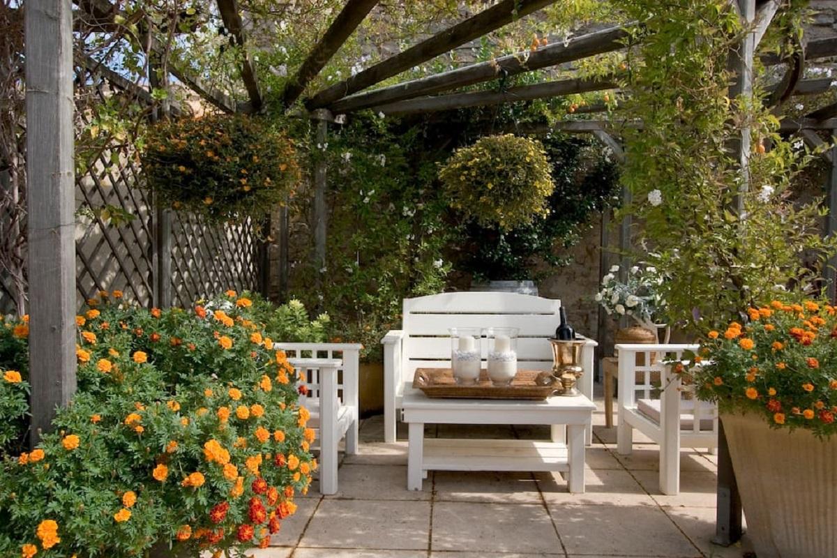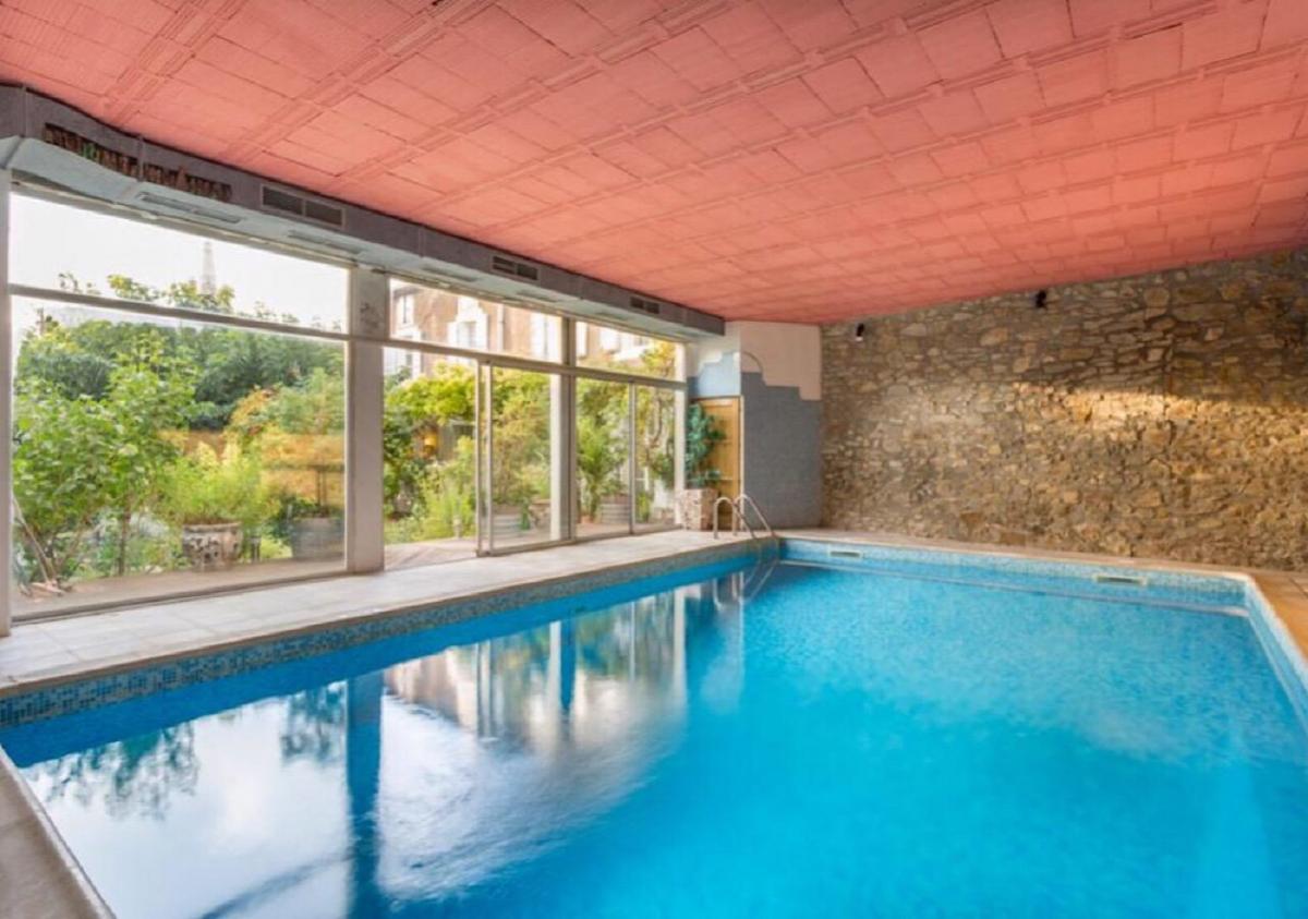 Outside = Lovely private irrigated mediterranean garden of 265 m2 with mature plants, flowers and trees (fully lit at night) + shaded dining terrace under plane trees + barbecue area of 60 m2 + glass fronted barn of 77 m2 with 8x5m indoor pool (sliding glass doors can be fully shut) + pool house below the front part of the pool with concrete steps down from the garden, provision of a ducted heating and ventilation system + roof terrace of 79 m2 with plants and great views toward the village church and beyond + external WC of 1.26 m2 + front courtyard of 40.43 m2.