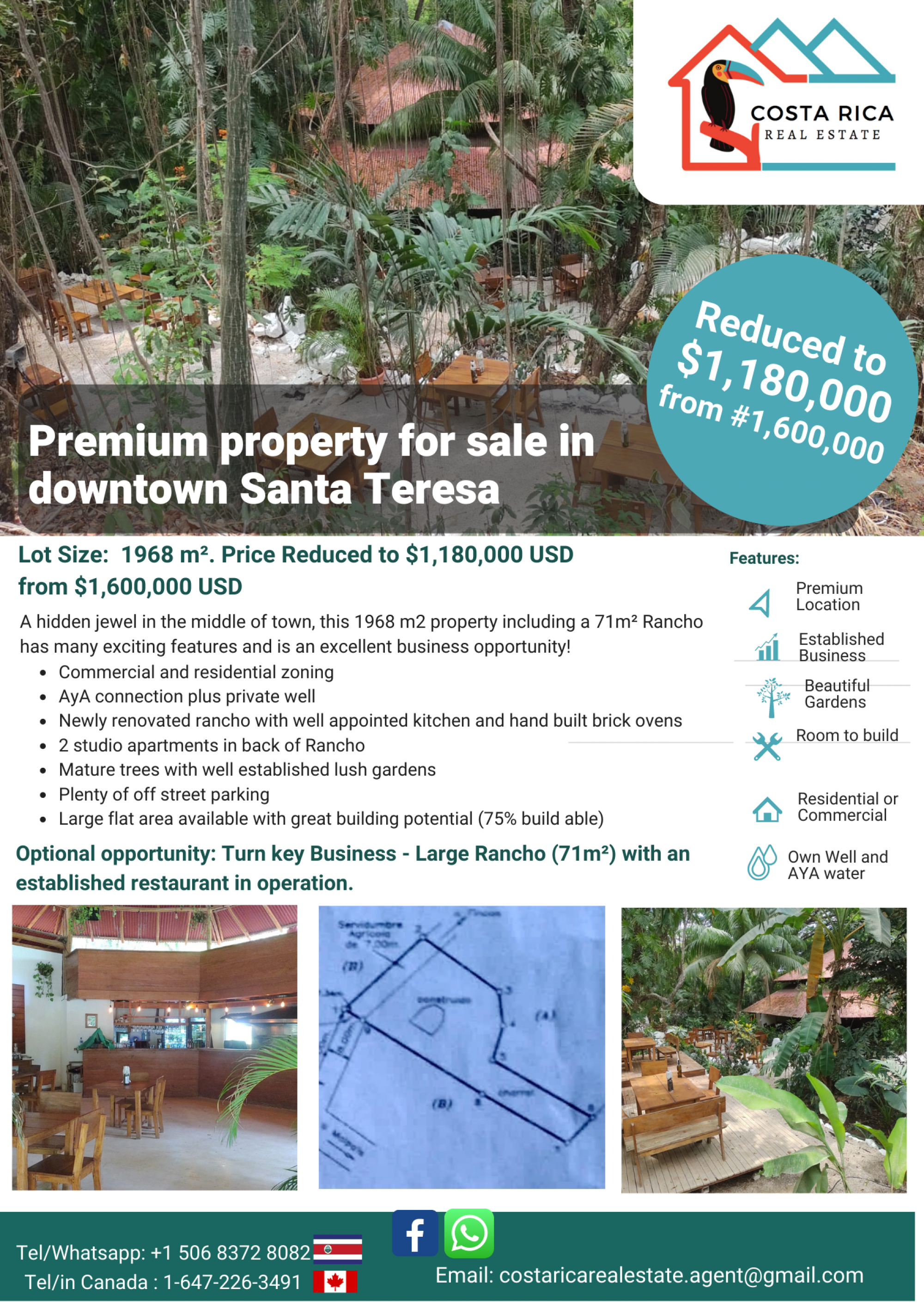 Premium Property for Sales in downtown Santa TeresaLot Size: 1968 m². Price Reduced to $1,180,000 USD (from $1,600,000 USD)