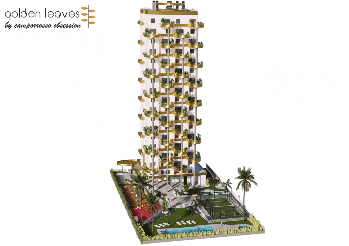 Exclusive homes with 3 bedrooms and 2 bathrooms, offer you a generous terrace with wraparound views that cover the highlights of the city: from Arenal beach to La Fossa beach, Las Salinas lagoon and, of course, the majestic Rock of Ifach. Enjoy every day the sunrises and sunsets that Calpe offers you. Located just a plot from the quiet lagoon, these homes have a swimming pool, paddle tennis courts, gym, calisthenics area and children's play spaces in large common areas. The exceptional aesthetics of the project are highlighted from a central axis, a trunk covered in ceramic in white and gold textures, creating a striking contrast with the glazed terraces that emerge like leaves in a luminous and bold golden tone. Welcome to your new home in Calpe, where sophistication meets luminosity! Contact us for more information.
