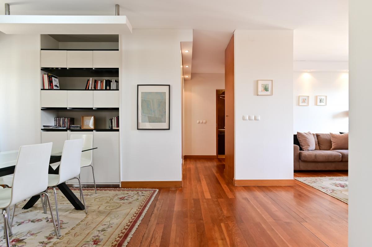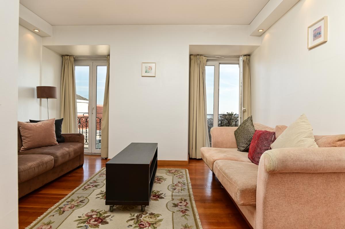 2-bedroom apartment for sale in Chiado, with an excellent location in the historic center of Lisbon, near Largo de CamAues and with a magnificent view over the city and the Tagus River.Inserted in a building with two fronts in good condition with elevator, the apartment consists of a large living room with separate living and dining area, two bedrooms with closet, one of them en suite with shower, modern kitchen fully equipped and another bathroom with bath. The apartment also has two balconies, one connected to the kitchen, where it is possible to place a table with two chairs, and the other, along the faA?ade, is accessible from the living room and one of the bedrooms.With a north-south sun exposure, the apartment has plenty of natural light, which makes it very bright and cozy. Totally renovated 10 years ago, the comfort was reinforced with wood floors, recessed lighting, double glazing, air conditioning and intercom. In order to enhance the space, the interior doors are sliding.With a premium location in the heart of Chiado and near Largo de CamAues, the apartment has good accessibility and is served by public transportation, including the tourist Tram 28, the Baixa Chiado subway and the Cais do SodrA(C) train station, which connects to Cascais. There are also public parks in the area.Chiado is a historical and touristic neighborhood par excellence, with several terraces, restaurants, stores, tourist and cultural spaces. Located between Bairro Alto and Cais do SodrA(C), it is an important commercial center and one of the most cosmopolitan and busy areas of the capital.