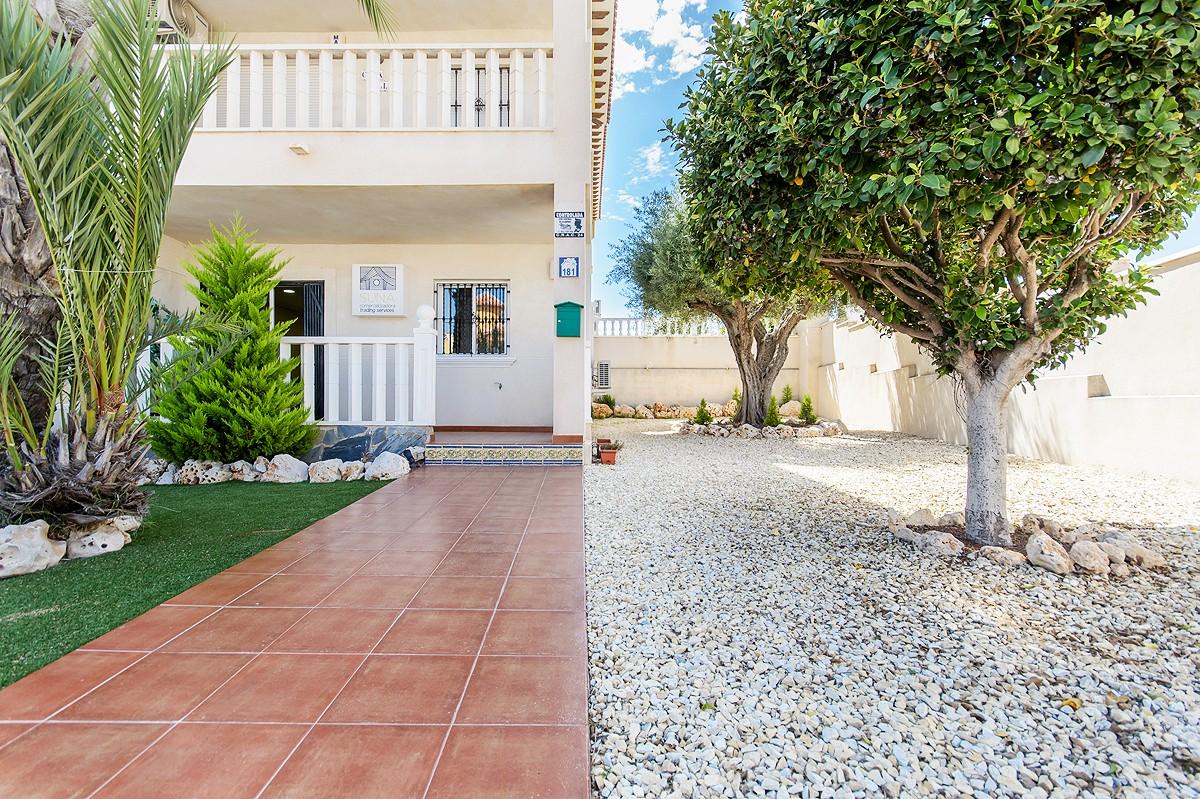 Ground floor housing that perfectly reflects the traditional Mediterranean style. With a generous corner garden of 134 m2, adorned with a majestic palm tree, a centuries-old olive tree, several ficus trees and other garden elements, this property will captivate you. Its west orientation guarantees abundant sunlight and magnificent sunsets. Located in the consolidated "Pinada Golf 2" Urbanization in Orihuela Costa, next to the VillamartA-n golf course, this residence is located in one of the most desired environments. A pleasant walk will take you to both the VillamartA-n golf course and the bustling VillamartA-n Plaza, the heart of the area, where you will find supermarkets, restaurants, bars and nightly entertainment options. The house is efficiently distributed, 2 cozy bedrooms with large built-in wardrobes, 1 full bathroom for your comfort, a spacious living room that invites you to relax, an independent kitchen with a large patio, perfect for your culinary moments. It also has a terrace with a porch that becomes your outdoor refuge. The corner plot with its lush garden is a gift for nature lovers. The air conditioning is already installed, so you can enjoy an ideal temperature at any time. The home is offered with office furniture (negotiable and not included in the price), which gives you the flexibility to adapt it to your needs. The Urbanization has 3 beautiful green areas, a large community pool that enjoys sun all year round, and a petanque court for the enjoyment of residents. This property is perfect for year-round living, as a vacation retreat or even as a headquarters for your business. With great potential for year-round rentals, it is a sensible investment and a place to make new memories in a Mediterranean setting. Contact us for more information.
