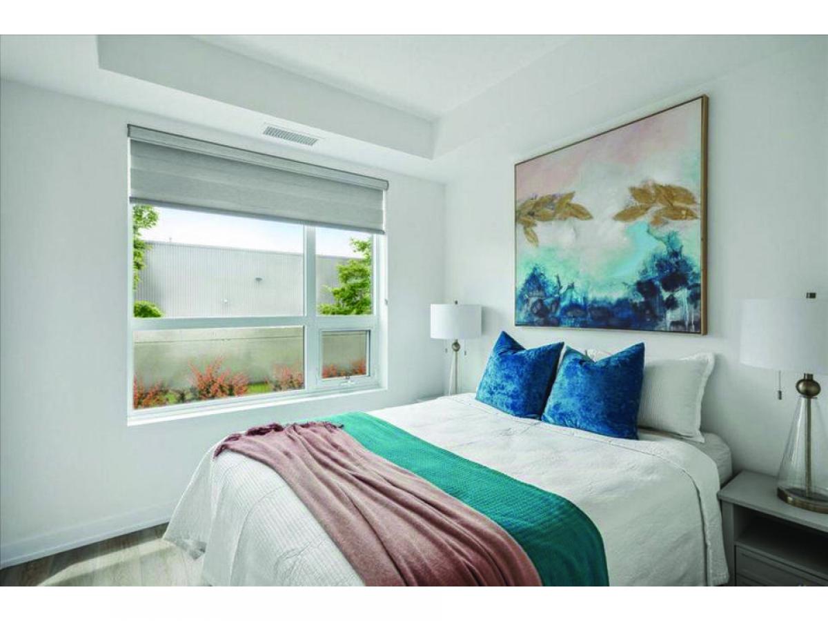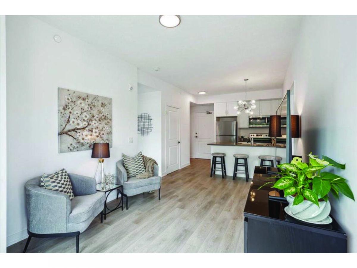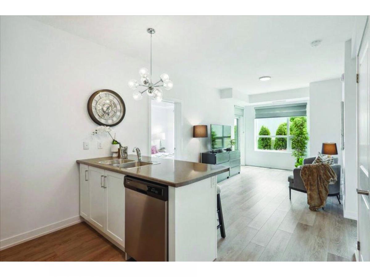 Fabulous 2 BR + Den, 2 full bath, offering 860 sq ft in this bright main floor private unit located at the back corner of the building, with walk out to L shaped patio. Vinyl laminate floors throughout, upgraded light fixtures, primary with walk in closet & ensuite with large shower, in-suite laundry. Great amenities including, beautiful courtyard, roof top patio, exercise room, party room. Locker conveniently located adjacent to unit, one underground parking spot.