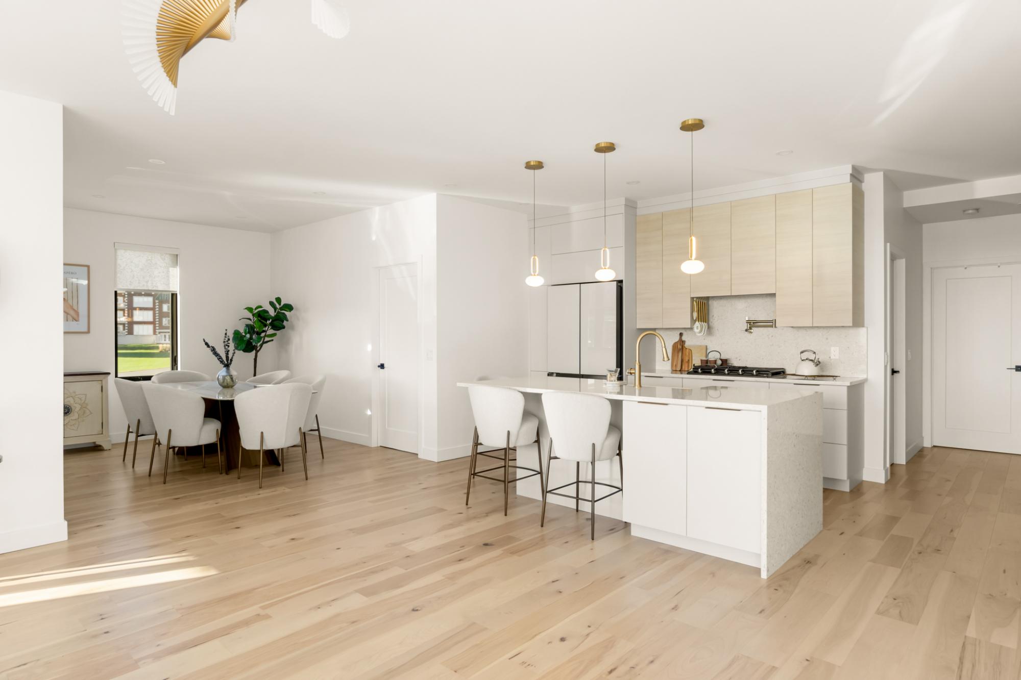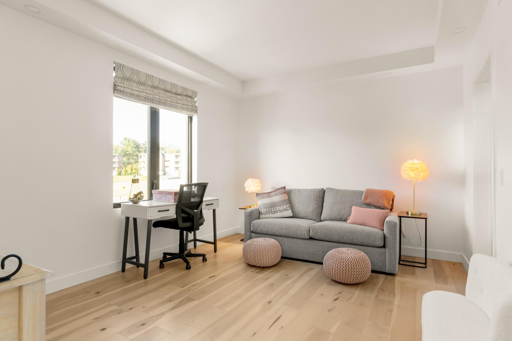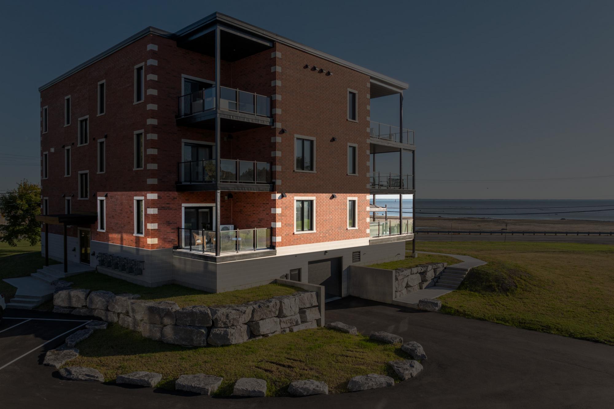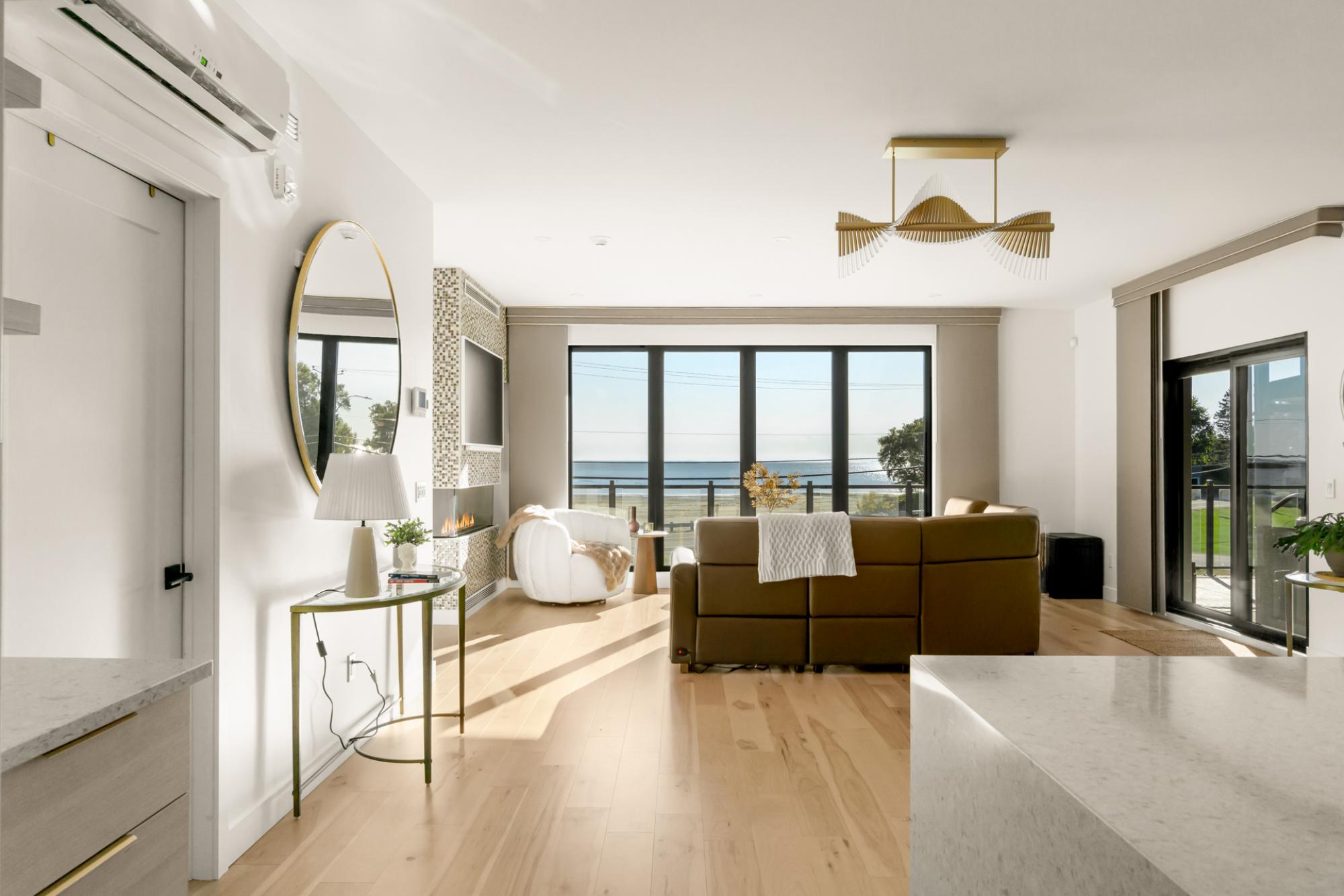 Overlooking Lac Saint-Pierre in Pointe-du-Lac, this prestigious Haltes du Roi project stands out through the purity of its lines, the quality of its structure, and the refinement of its materials: concrete, masonry, quartz, engineered wood, triple glazing, and superior acoustic insulation. Its generous 1,600 sq. ft. layout blends natural light with noble materials, featuring ceilings over 9 ft., panoramic windows, radiant flooring, two south-facing covered terraces, a cascading quartz island, and custom finishes. Ready for immediate occupancy, this unit embodies the highest standard of luxury living in the Mauricie region.