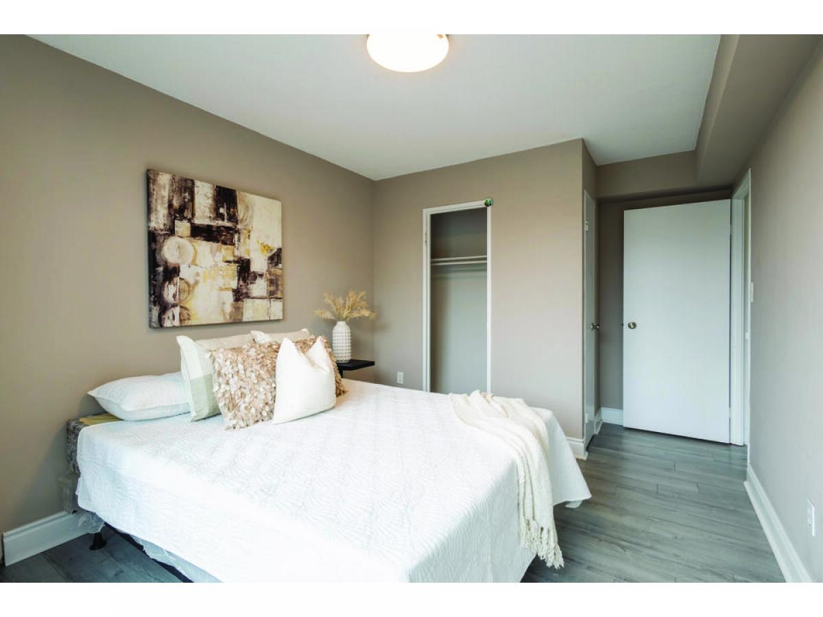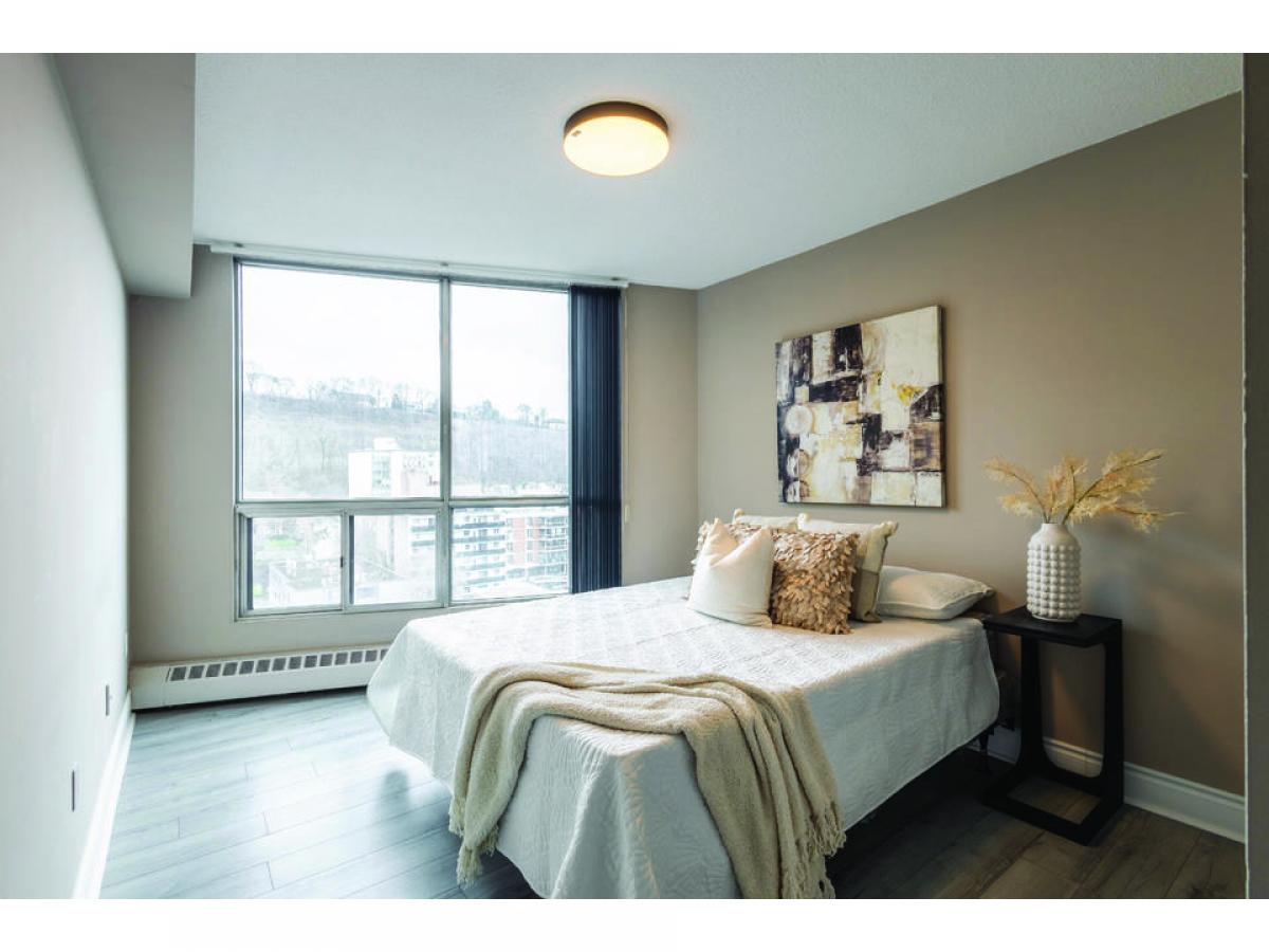 This well-appointed two-bedroom, two-bathroom unit is ideally situated near St Joseph's and Juravinski Hospitals, parks, trails, public transit, the GO Train station, downtown, dining, and shopping venues. It boasts an open-concept layout and features a walkout balcony from the living room. Floor-to-ceiling windows provide stunning, unobstructed views and flood the space with natural light. The interior is painted in neutral colours and is equipped with laminate flooring throughout, along with in-unit storage. The condo building offers a range of amenities including an indoor pool, sauna, billiards room, gym, squash court, party/meeting room, visitor parking, a sun deck, a coin-operated laundry on the second floor, and a security system. Great opportunity for first time buyers or those looking to downsize. Stove, Fridge, All Window Treatments And All Electrical Light Fixtures. Condo Fees Include: Building Insurance, Common Elements, Exterior Maintenance, Heat, Hydro & Water, Parking.