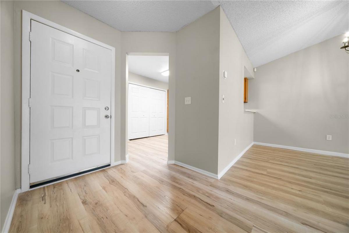 Welcome to this light-filled 2-bedroom, 2-bath villa in the heart of Ocala. With 945 square feet of thoughtfully arranged living space, vaulted ceilings, fresh paint and new flooring throughout, the interior offers a fresh, airy atmosphere from the moment you walk in.The main living area flows naturally into a defined dining space and corner kitchen, complete with wood cabinetry, a full appliance suite, and laundry access. The layout separates the bedrooms for added privacy, with the primary suite offering a walk-in closet and an en suite bath with step-in shower. A full guest bath, interior laundry, and designated foyer entry round out the interior. Sliding doors open to a tiled screened porch with a private storage closet and a view of the open green space beyond.Just across the street from the pool, this villa enjoys one of the best locations in the community. Residents have access to a large pool with sundeck, shaded seating, and a relaxed neighborhood atmosphere. HOA dues include roof and exterior upkeep, lawn service, trash collection, and pest control, offering ease of ownership close to medical centers, shopping, and Downtown Ocala.