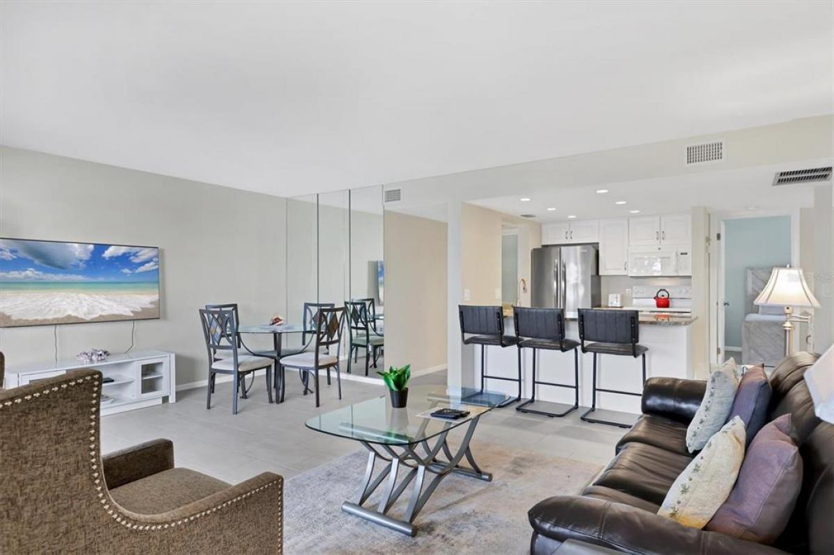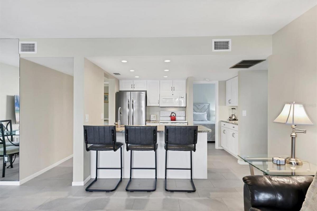 Welcome to this gorgeous WATER FRONT condo in desirable Midnight Cove II on beautiful Siesta Key! This coastal designed, TURNKEY furnished 2 bedroom beauty is move-in ready.. just bring your bathing suit and a toothbrush and you are off to the beach with its deeded walkway access or hop on your boat that you can dock just steps away! Huge glass sliding doors open to the screened and tiled lanai with a stunning and expansive view of the inter-coastal waterway and south bridge. It's your private birds eye view to watch boats, dolphins, birds and all the abundant nature in your own little piece of paradise! Kitchen is updated and charming with granite counters, soft close cabinets and drawers, a coffee bar and eat-on counter, all open to the tropical views and updated tiled living areas. Bathrooms are stylish with a newly tiled walk-in shower and raised vanities. Condo has a convenient laundry closet with washer and dryer, and an outside storage closet with plenty of room for your sports equipment and beach toys. If you are looking for a rental investment, it may be leased on a weekly basis and offers an onsite management company. The amenties are top-notch and include a heated pool, clubhouse, deeded beach access, direct inter-coastal waterway access, fishing, boat docks, basketball court, tennis/pickle ball courts, grilling areas, and kayak storage. Location of Midnight Cove II is sought after...walking distance to the local market, famed restaurants and bars, and shopping. Also it s close to pop over the bridge to the mainland to enjoy the arts scene, downtown and all else Sarasota has to offer! Or... jump on the free trolley.. access just outside of the community and it takes you to the bustle of the Siesta Village or to the South end of the island to Turtle Beach! So much to explore and enjoy in your new Siesta Key home! Buy a condo, and LIVE THE ISLAND LIFE-STYLE!