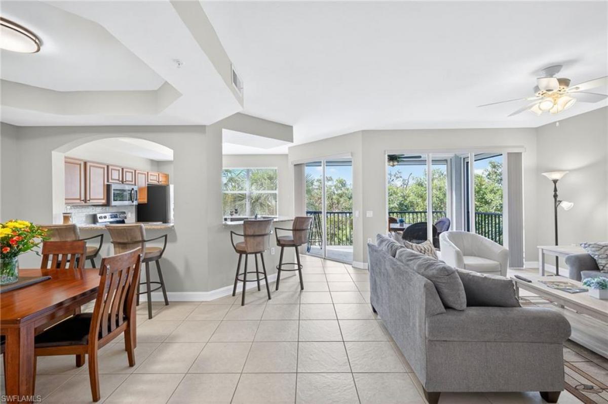 Twenty seven hole championship golf course, 14 pickleball, 8 tennis, bocce and boating are all INCLUDED in the purchase of this move-in immaculate home! Two bedroom, 2 bath condo with well appointed features is being sold TUNRKEY furnished. Everything has been done, just unpack and enjoy! The open floor plan creates a warm space to entertain family and friends. The kitchen offers granite counter tops, stainless steel appliances, tile backsplash, and a breakfast bar. The primary suite features a tray ceiling, two closets, one a walk-in, and an updated en suite bath. The guest bedroom offers two twin beds and a wall mounted TV, right across from the recently updated guest bathroom. Enjoy your morning coffee or an evening beverage on the peaceful, two sided screened lanai, with lush tropical vegetation, tile flooring and electric hurricane screens. The refrigerator, dishwasher and hot water heater were all replaced in 2024. Every detail has been thoughtfully curated to offer a relaxed, beach-inspired ambiance. Located right near the largest community pool and walking distance to all of the fabulous amenities this bundled community offers. If you are looking for an active lifestyle look no further: 27 holes of Championship golf, 14 pickleball, 8 tennis and 6 bocce courts. State of the art fitness center that is professionally staffed. Pelican Sound is nestled up to the Estero River with access to the Gulf of Mexico. The community offers dry boat storage, kayaks, canoes and paddle boarding, along with a shuttle boat to Lovers Key State Beach Park. Minutes from RSW International airport and surrounded by fabulous shopping and restaurants. Start Living The Dream!