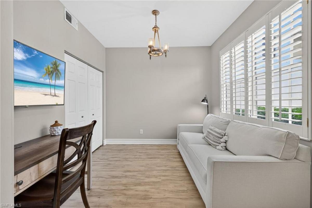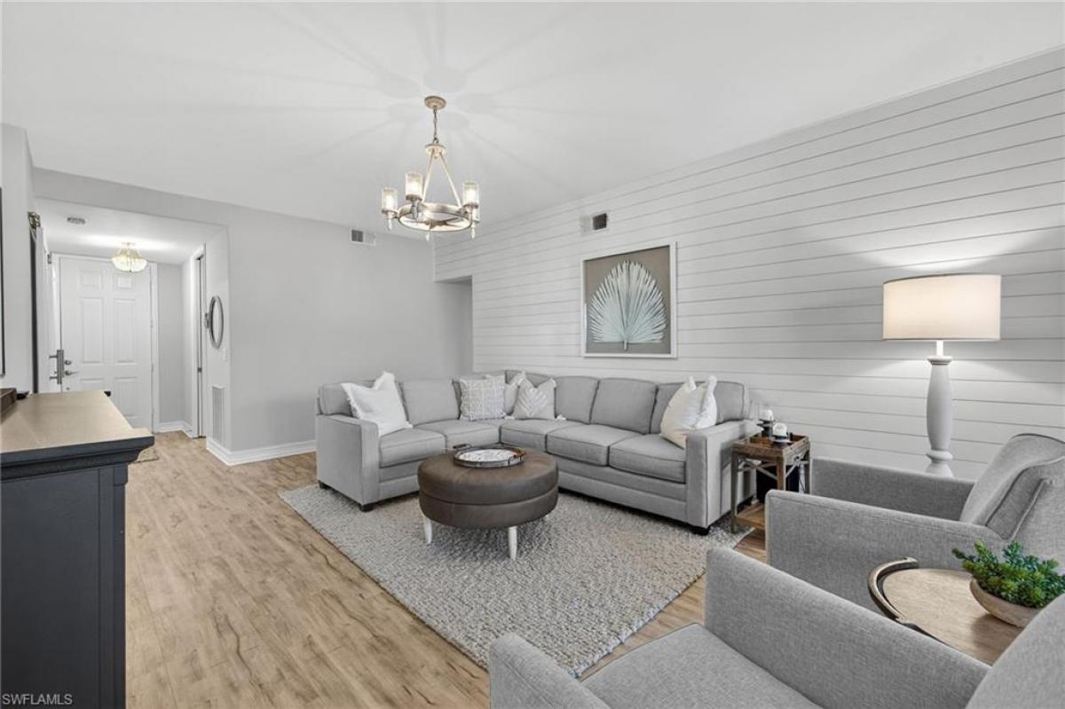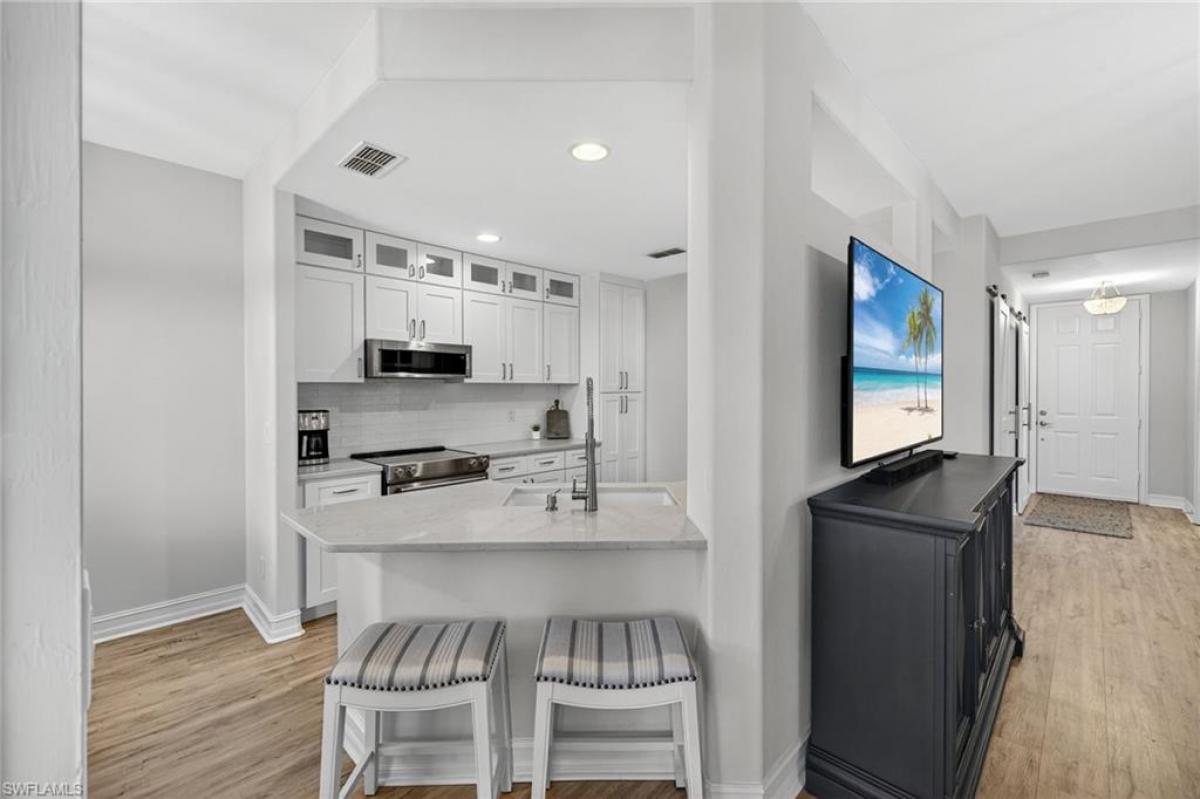 Beautifully updated first-floor coach home featuring luxury vinyl flooring and plantation shutters throughout. The completely renovated kitchen boasts KitchenAid stainless steel appliances, soft-close drawers, and quartz countertops. Sophisticated touches include a shiplap accent wall in the living room, designer light fixtures and sliding barn doors leading to the den. The den offers a closet and can serve as a third bedroom. The primary suite includes lanai access, a custom walk-in closet, and an updated bath with dual sinks, a walk-in shower with bench, and a frameless glass door. The guest bedroom and bath are tucked away for privacy, with the guest bath also updated and featuring a frameless glass shower door. Additional highlights include a newer LG front-load washer and dryer, extra cabinetry in the laundry room, and electric hurricane shutters across the lanai. Enjoy morning coffee or evening cocktails on the peaceful lanai overlooking the fairway. If you are looking for an active lifestyle look no further: 27 holes of Championship golf, 14 pickleball, 8 tennis and 6 bocce courts. State of the art fitness center that is professionally staffed. Pelican Sound is nestled up to the Estero River with access to the Gulf. The community offers dry boat storage, kayaks, canoes and paddle boarding, along with a shuttle boat to Lovers Key State Beach Park. Minutes from RSW International airport and surrounded by fabulous shopping and restaurants. Start Living The Dream!