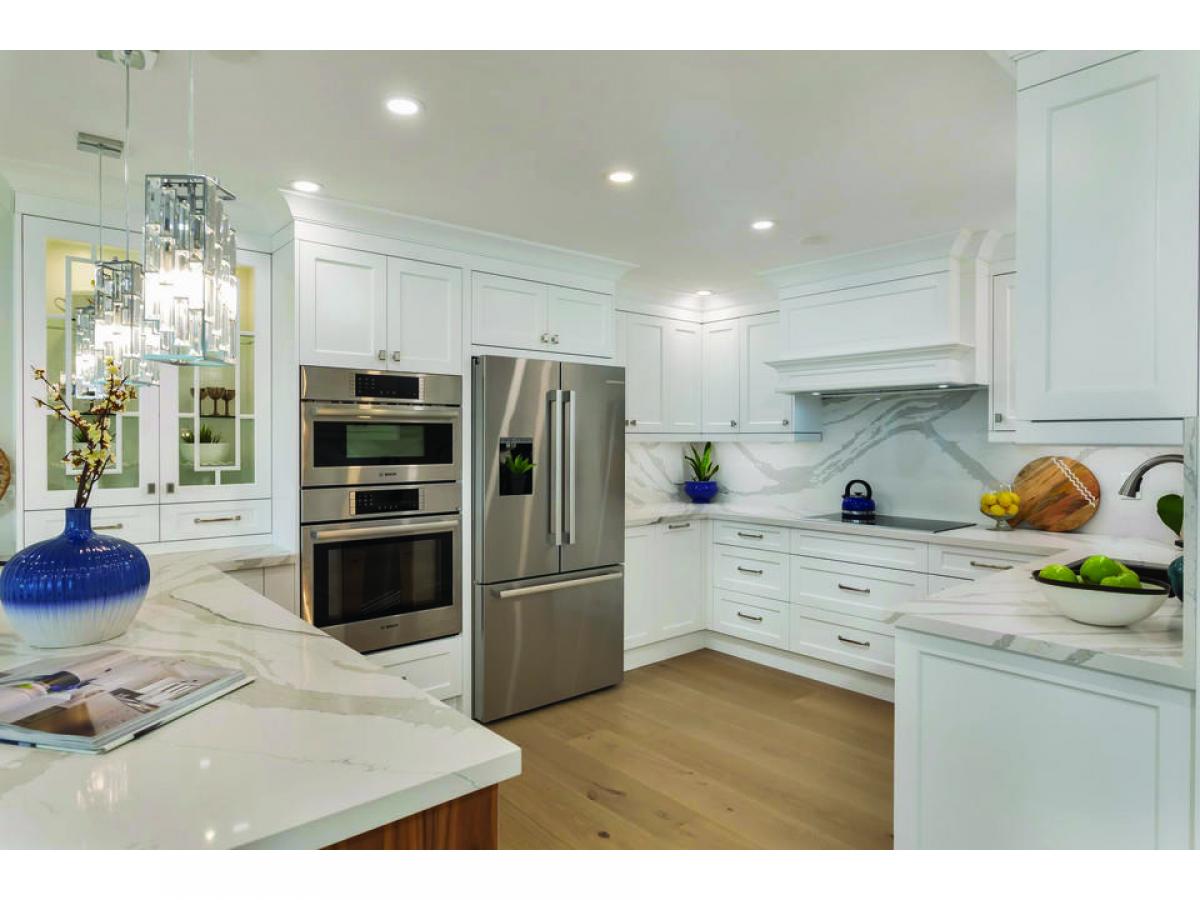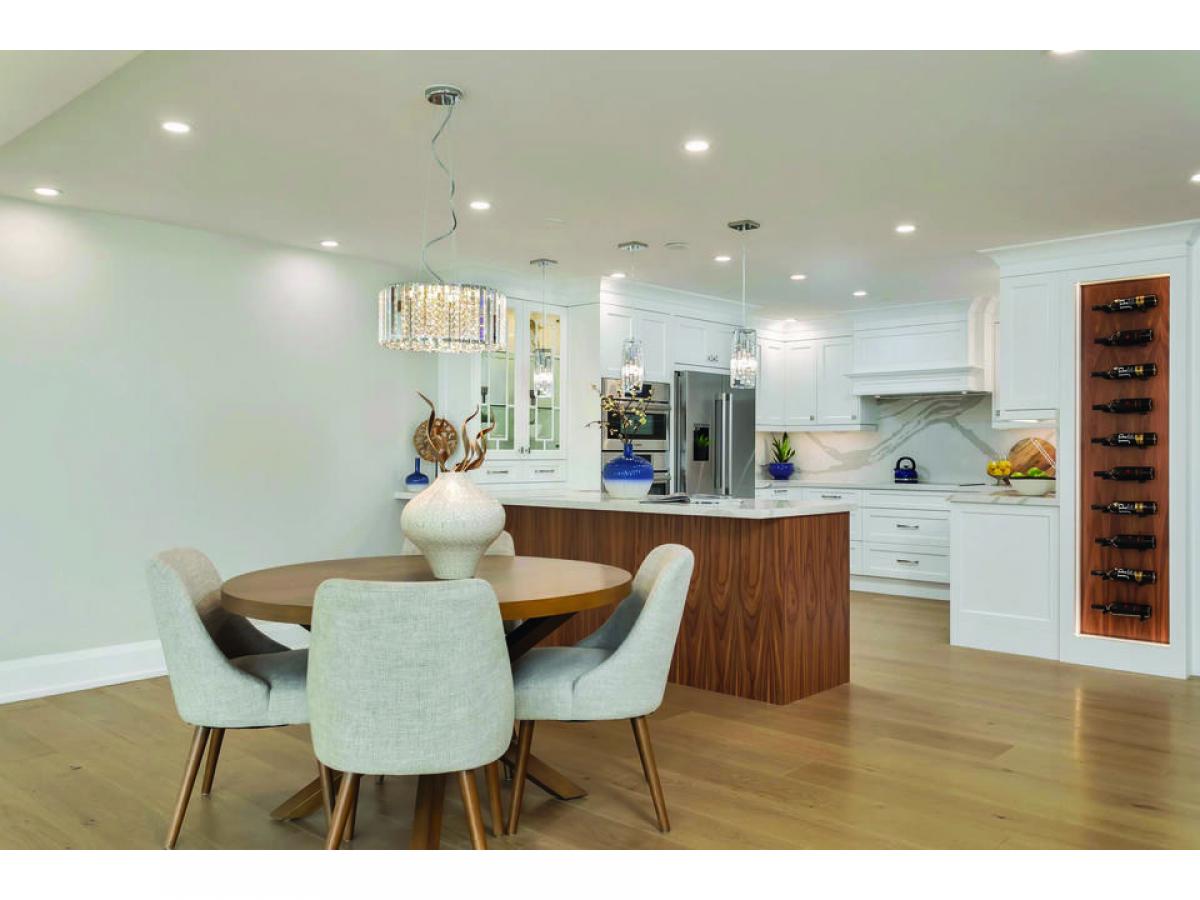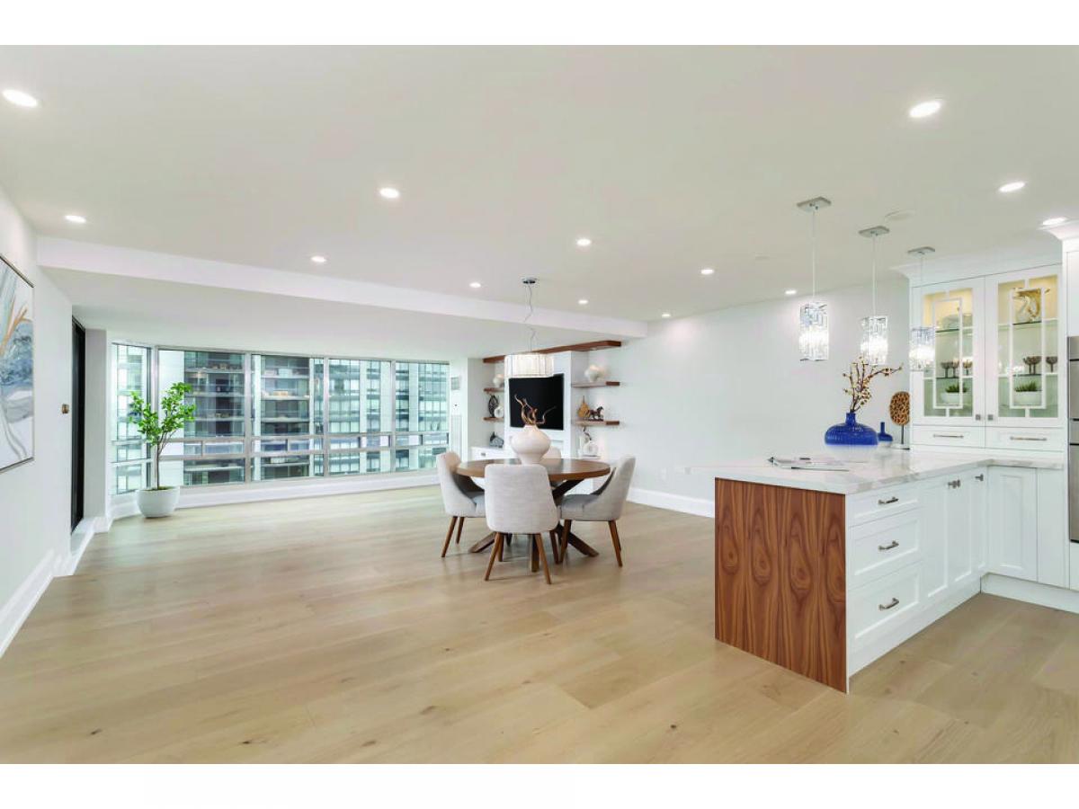 9.5â wide engineered white oak flooring throughout. 7.5â baseboards. Smooth ceilings and pot lights. All quality materials and fixtures tastefully co-ordinated. Stunning off white custom kitchen with wood drawers, glass accents and crown mouldings, quartz countertop and backsplash, double sink, brushed nickel hardware. Kitchen cabinetry extends to peninsula with seating for 3. Pendant lighting. Wine rack. Kitchen open to dining area. Living room with beautiful wall of built-in cabinets, floating shelves, 65â TV and attractive 60â Napoleon electric fireplace. Both bedrooms with walkouts, ample storage and wall detail. Luxurious primary suite with walk-in dressing room with built-in organizers for clothes, jewelry and shoes. Custom wall mouldings, pendant lighting for end tables, lights on dimmers. Gorgeous primary bath with custom vanity, 36â clean white marble look porcelain tile and Kalia plumbing fixtures in glass shower. Laundry room with LG front load washer and dryer, custom cabinet and lots of storage. Bright western exposure with beautiful lake and marina views from living room, dining room, kitchen and balcony. 3 walkouts to large balcony. High-end materials and excellent workmanship. Well run building with outstanding amenities set on the lake in Bronte. Wonderful lifestyle opportunity.