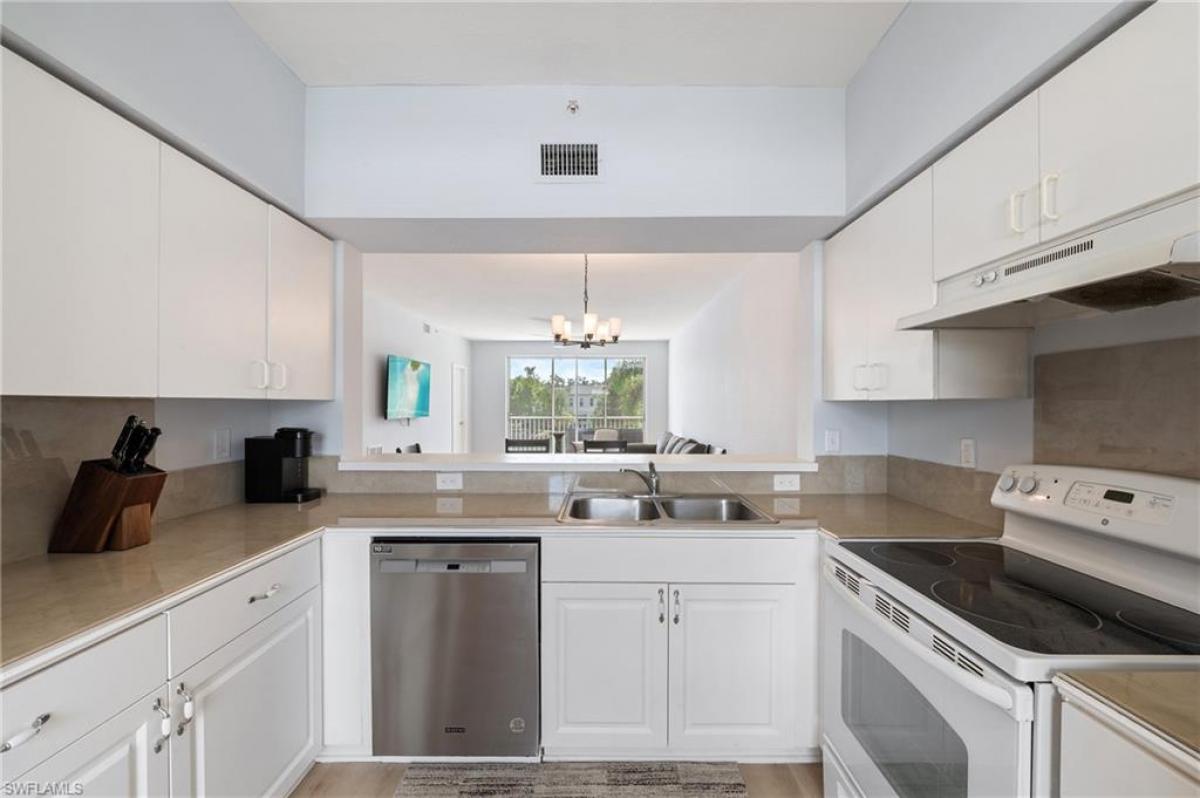 Welcome to your slice of paradise in Naples! This beautifully maintained 2-bedroom, 2-bath condo offers comfortable coastal living just over 3 miles from the Gulf beaches. The light-filled open floor plan features a spacious great room, well-appointed kitchen, and private screened lanai, with lake and pool views Perfect for morning coffee or evening sunsets. The following were all done in 2025, flooring, spray create on lanai, primary toilet, blinds, fridge, dishwasher, kitchen countertop, painted and new lower cabinets in the kitchen. Enjoy the convenience of a covered carport, in-unit laundry, and access to community amenities. Ideal as a year-round residence, vacation retreat, or investment property—all within minutes of shopping, dining, and Naples’ white-sand beaches.