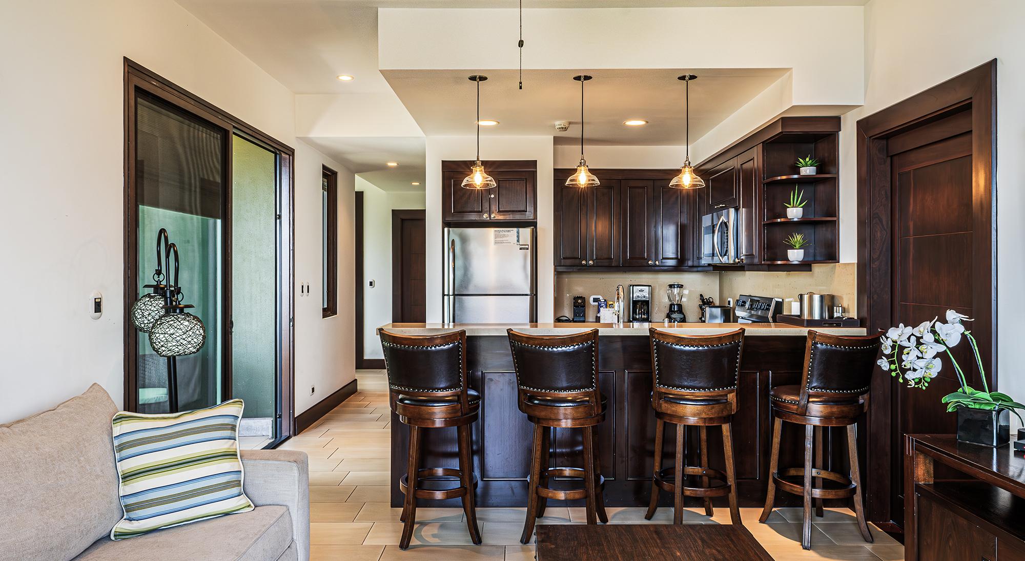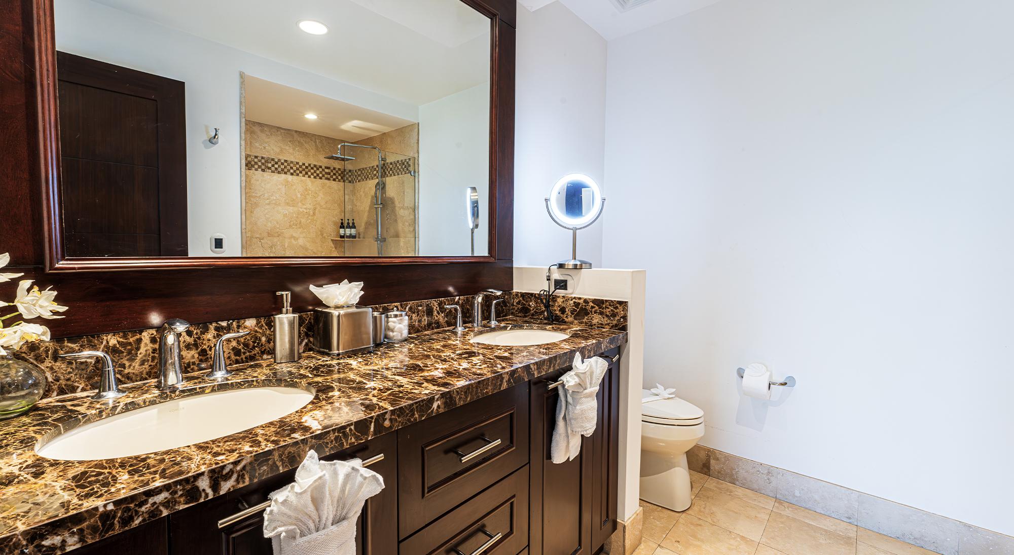 Down the hall, you’ll find a small laundry closet with a full-sized washer and dryer, the master bedroom, and the luxury bathroom. The bedroom features a comfortable king-sized bed, a flat-screen television, ample closet space and amazing water and natural vegetation views. The bathroom, located just outside the bedroom, includes double granite vanities and a walk-in shower with a built-in bench and a rainfall showerhead.