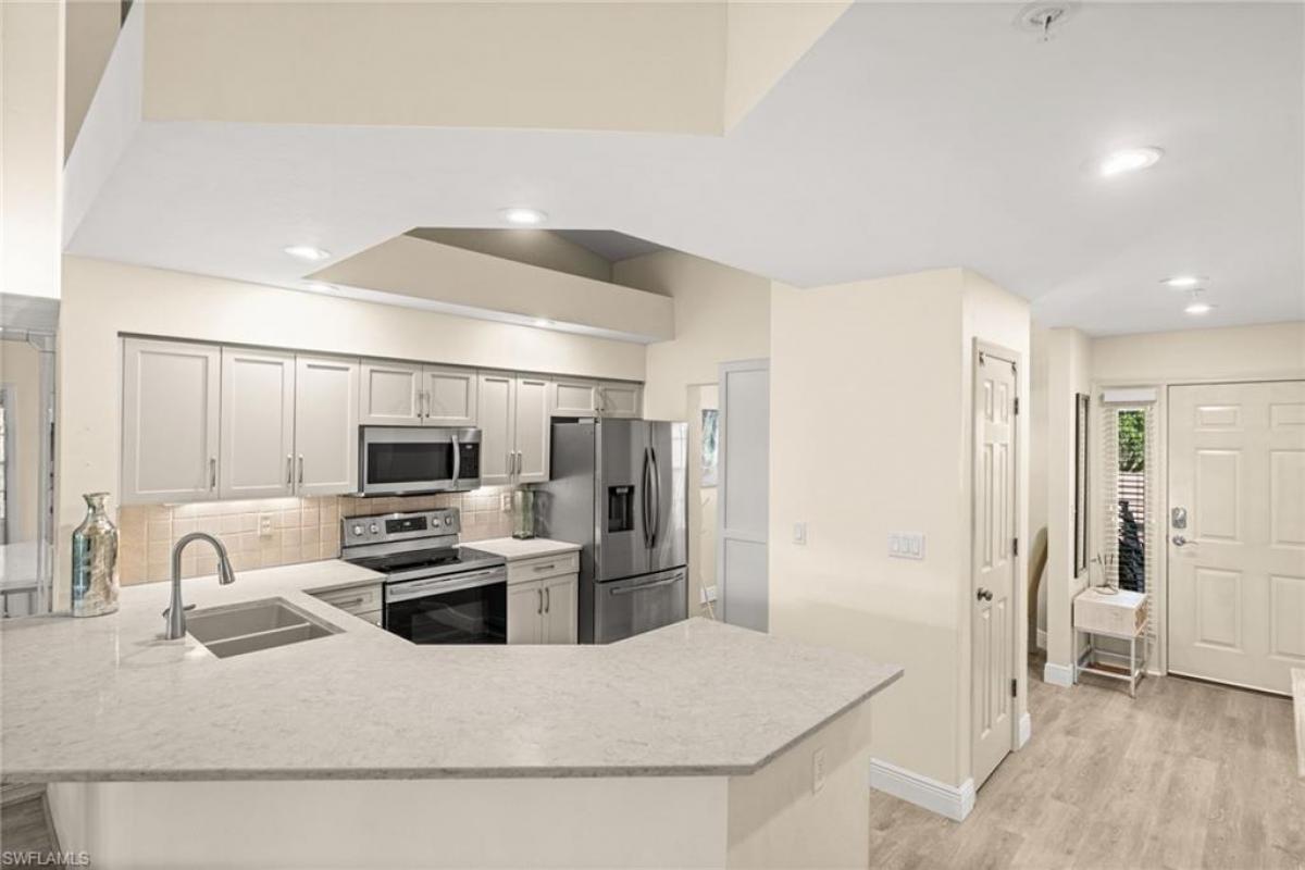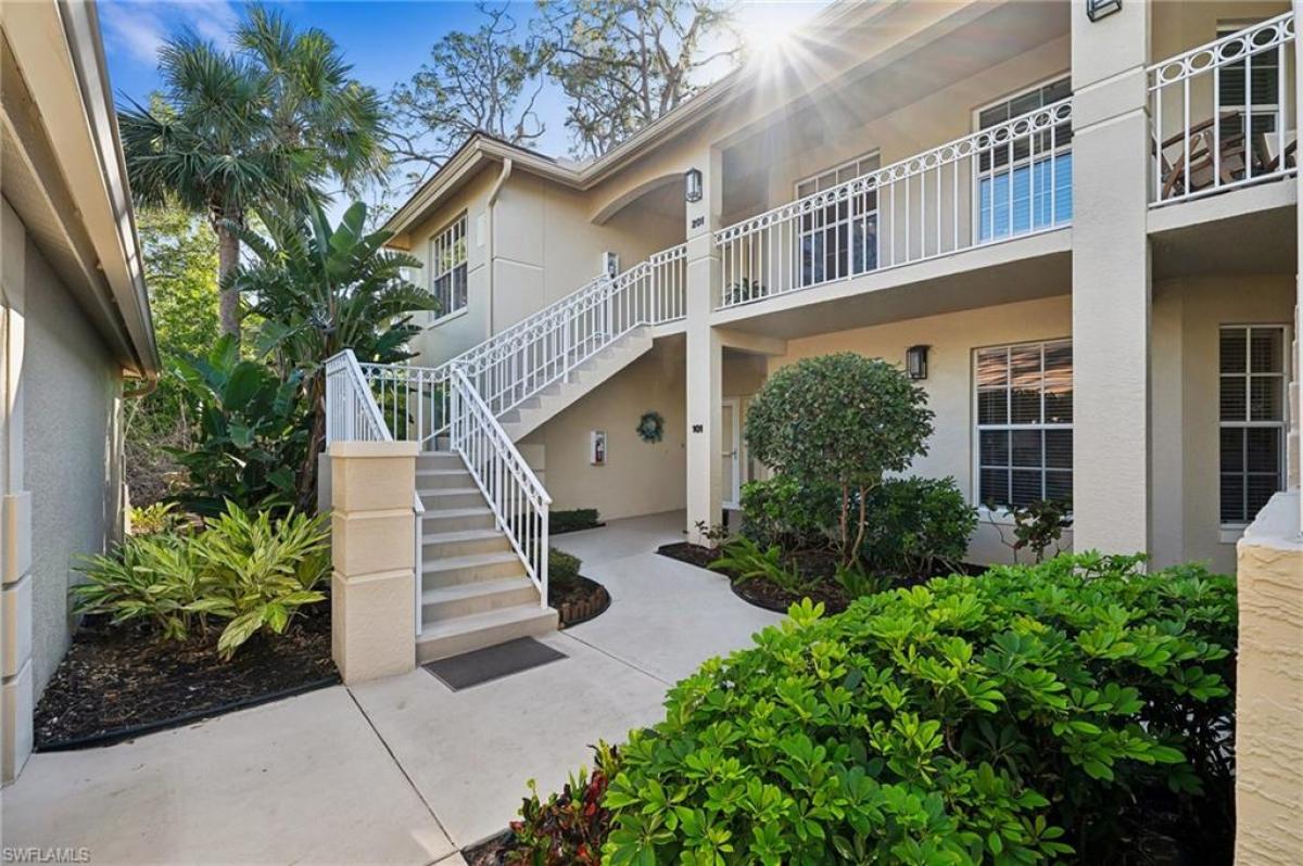 Welcome to 4101 Sawgrass Point Drive #201, a luxuriously renovated end-unit residence with third bedroom plus flexible breakfast room/office, and breathtaking lake and golf views. Passing through the sun-kissed courtyard and parting the front door, one is immediately welcomed by soaring vaulted ceilings and a degree of natural lighting only a second-floor end-unit could provide. The central open kitchen unifies and elevates surrounding living spaces, featuring quartz countertops, crisp shaker cabinetry, and stainless steel appliances. Warm-toned wood-look flooring stretches wall-to-wall, a market favorite, while primary suite showcases freshly updated shower and quartz countertops, and guest suite has a new vanity of its own. This versatile floor plan includes both a flexible breakfast room and separate third bedroom/bonus room that can be reconfigured to suit one’s needs, spaces that we’ve seen used as extra bedrooms, studios, dining rooms, bunk rooms, offices, and home gyms. Perhaps most noteworthy of all is the view: tucked among the treetops, unparallelled panoramic views spanning two signature holes of golf, multiple bodies of water, and a whole host of wildlife and native entertainment. This is one of the single most mesmerizing views of any condo we’ve had the privilege of visiting in Pelican Landing, and the photos do not do it justice—must see in person. No special flood zone; no history of flooding; electric roll-down hurricane protection on lanai for peace of mind. In addition to Sawgrass Point's resort style pool and spa, Pelican Landing residents enjoy world-class amenities, including a 34-acre private island beach club, gulf access sailing, kayaking, and boat ramp, 12 Har-Tru tennis courts, pickleball, bocce, and a fitness center. This home is conveniently located within walking or biking distance to the community center, grocery store, pharmacy, and numerous casual and fine dining options. Additionally, optional memberships are available at The Nest Golf Club, featuring 36 holes of championship golf and a newly renovated clubhouse. Waitlists due to high demand at The Nest may apply. Schedule your private showing today!