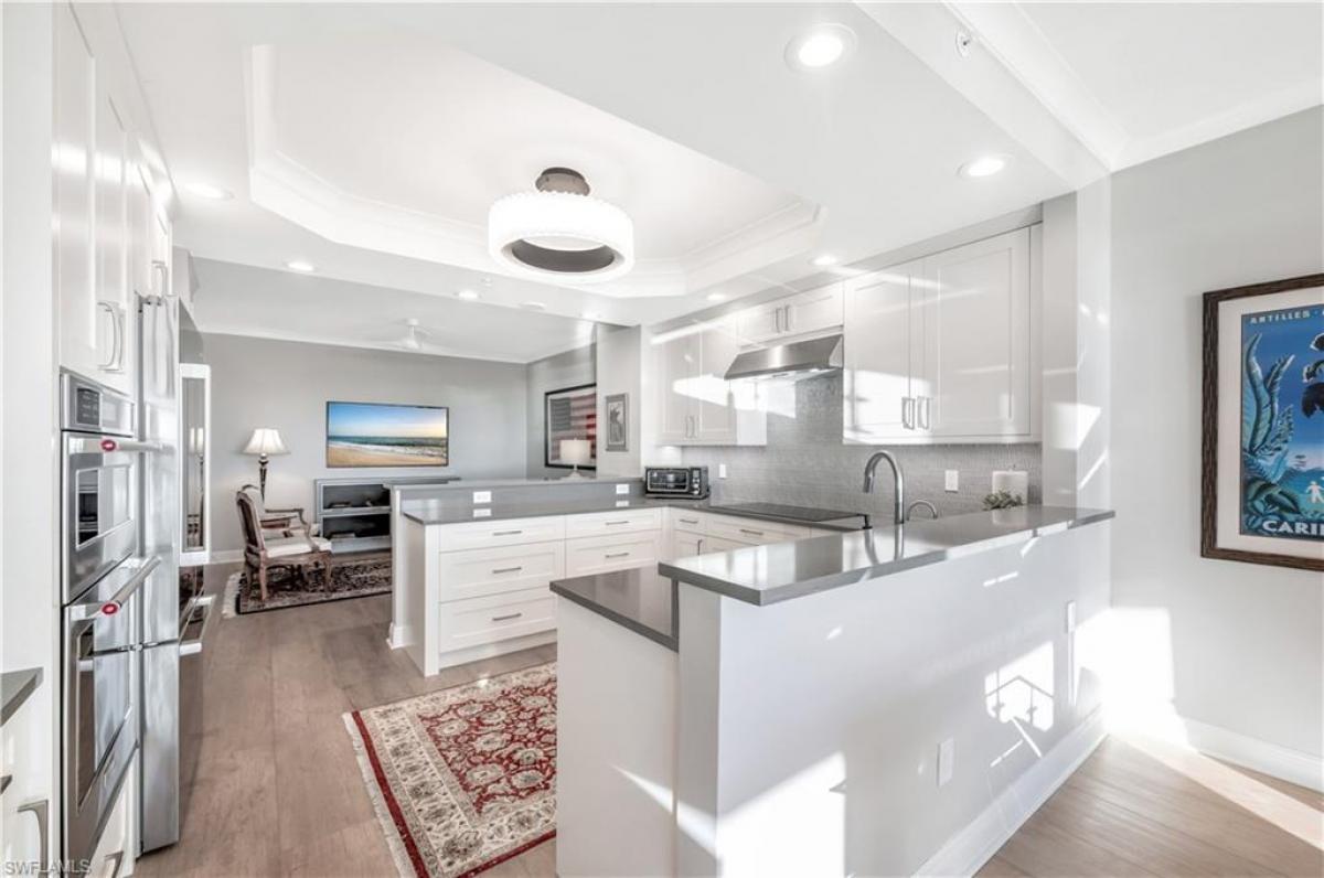$154,000 PRICE REDUCTION!! Resort style living with stunning sunset Gulf views from this newly renovated luxury 9th floor 3 bedrooms + den, 3 ½ bath condo! Step off your private elevator into your foyer, which opens into a spacious great room/dining room with expansive Gulf and preserve views. Guest room lanai overlooks the new golf course and city lights. Nevis #903 has been completely renovated and professionally decorated. Renovations include all new cabinets and flooring throughout, quartz and marble countertops, all new top line appliances including washer/dryer, crown molding, new plumbing fixtures and comfort height toilets, 5 large new TVs, and modern LED decorative lighting and fans. A dry bar with full size wine and beverage cooler was added in the great room and is great for entertaining. The kitchen area was redesigned to include a 36 induction cook-top and hood, large white apron fireclay sink, ice maker, and a large pantry cabinet added for extra storage.New 2 zone HVAC system. All bedrooms are en-suite and feel very private. Hurricane windows throughout with electric hurricane shutter protection on the large 26’ lanai. The condo includes 1 deeded parking spot with ample guest parking. The building lobby is professionally decorated in a contemporary style. Membership is included to the Calypso Club next door which has a resort sized pool, spa, fitness center, social room with wet bar and kitchen, Cabana room off the pool with fireplace, grill area, and 2 private guest suites for your use. Membership is available to the Tarpon Cove Yacht & Raquel Club with 6 tennis courts, bocce ball, restaurant, tiki bar, swimming pool and hourly beach shuttle to Barefoot Beach Park. Boat slips can be purchased or rented. Luxury living is waiting for you at Cove Tower!