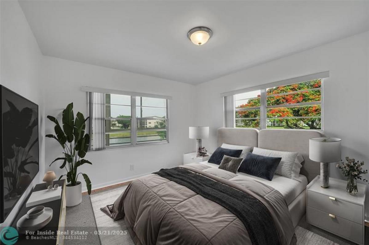 Immaculate, Light, Bright & RENOVATED CORNER; 2 bedrooms 1 1/2 baths overlooking an expansive lake. Neutral ceramic tile flooring throughout the living, dining and kitchen & Laminate bedrooms. Updated kitchen with wood cabinets, granite, Stainless Steel appliances and new lighting enhance this very desirable condo. Popcorn has been removed from the ceilings, new electric panel and water heater. Enjoy viewing the pretty flowering poinsettia trees and wide lake from every window. Move-in Ready! Take advantage of all the amenities offered at Century Village including Clubhouse, Fitness center, Theatre, House of worship, transportation and much, much more. Centrally located, active 55+community close to shopping, major roads and restaurants.