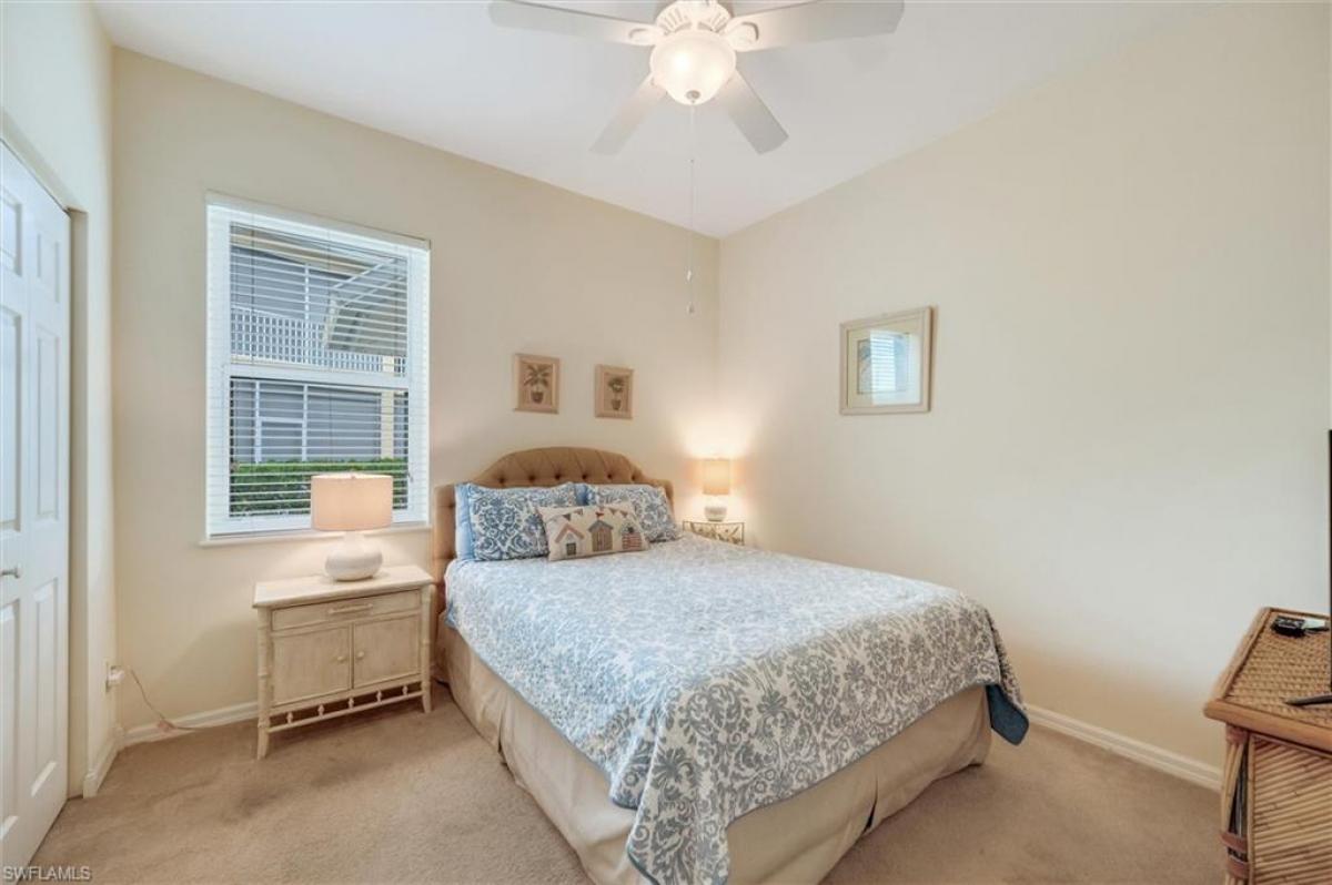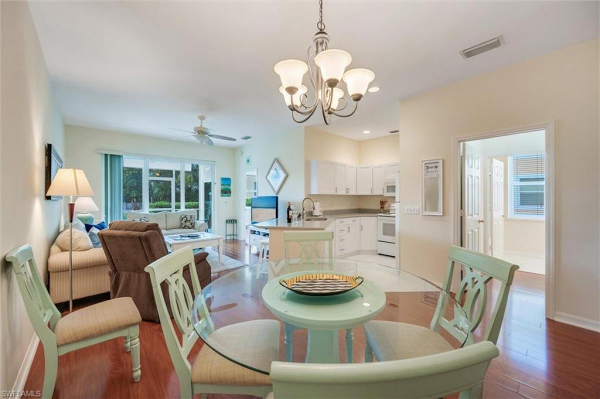 This 3-bedroom, 2-bath condo lives more like a single-family home than a condo. Located on the first floor, the high ceilings immediately create an open, home-like feel. The remodeled kitchen features beautiful Shaker-style cabinetry topped with luxurious quartz countertops, newer appliances, abundant cabinet storage, and a generous workspace - perfect for the home chef. An extended countertop provides casual seating, or enjoy meals just steps away in the dedicated dining area. Beautiful wood laminated flooring in the main living rooms add a sophisticated feel. A storage pantry at the entrance holds a ton of things like your vacuume, small tools and more. A water filter system is also in place. The spacious primary bedroom offers direct access to the lanai. The en-suite bath includes dual sinks, a walk-in shower, and an oversized walk-in closet with ample storage. Coastal-themed furnishings are included, and the third bedroom, currently used as an office/den features a pull-out sofa for additional guests. The second bathroom includes a tub and extra cabinetry for added convenience. An in-unit washer and dryer are tucked neatly into their own space, and a charming coffee bar adds both function and flair. Step outside to the large lanai with a sunshade, which opens directly to the community pool and chickee hut dining area, perfect for relaxing or entertaining. Now let's get real for a moment. Do you know what many people moving from up north miss most when they buy a condo? Not family. Not friends. Not even the snow. It's a garage...one that leads right into their home. And this condo delivers. Enjoy your own private one-car garage with room for your vehicle, storage, and yes, even that snow shovel that made the trip to Florida. This property features hurricane-rated windows and sliders and is built at a high elevation, having weathered past storms with no ill effects. The association is in excellent financial shape, and the grounds are meticulously maintained. Restaurants, bars, grocery stores, shopping, banking, medical offices, and more are just steps away. Come take a look and be amazed at everything this home offers for the money. Being sold turnkey, with all furniture, kitchenware, and linens included.
