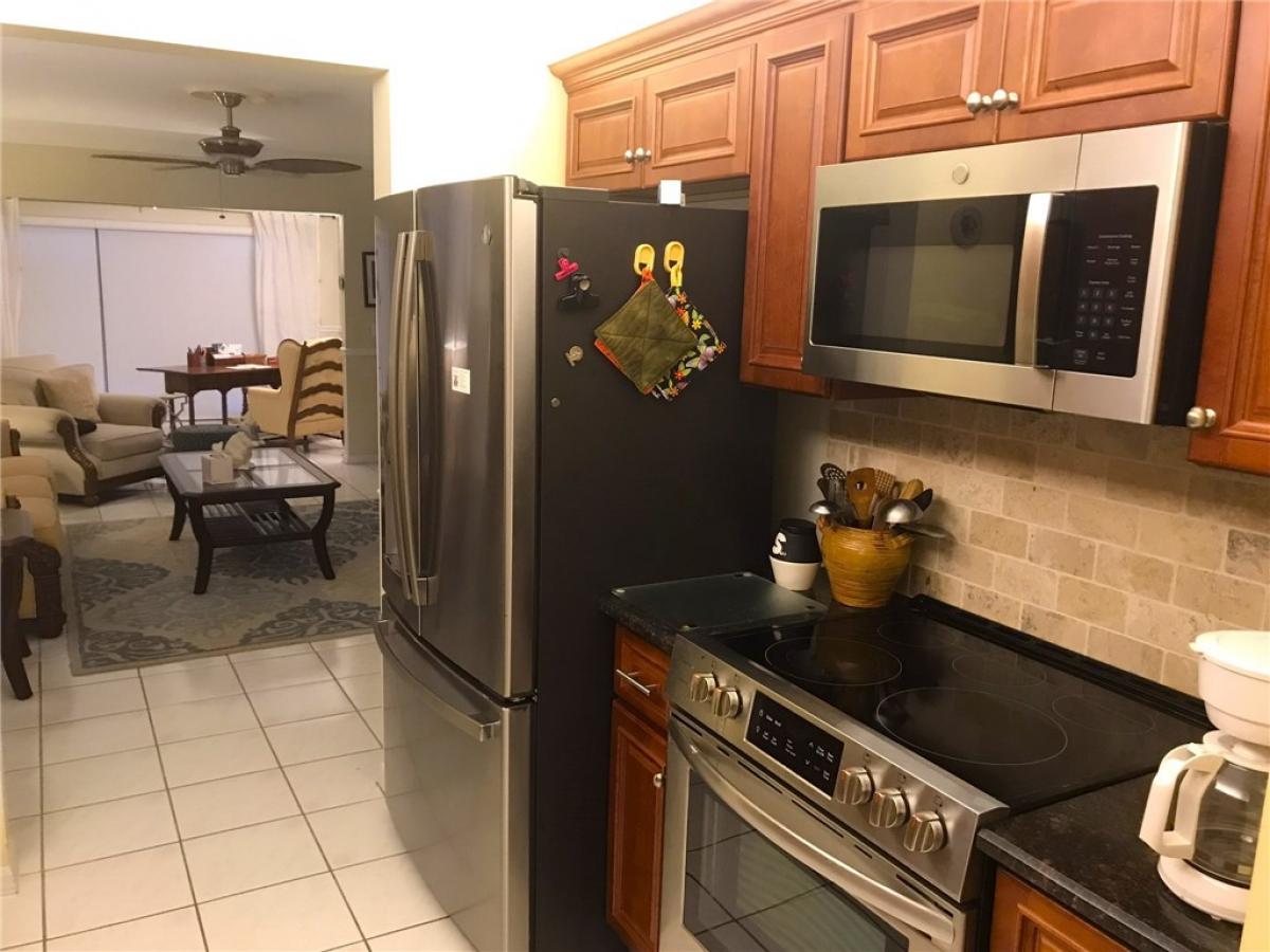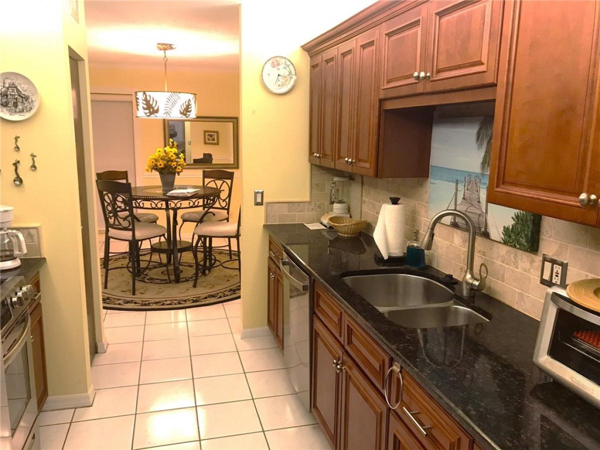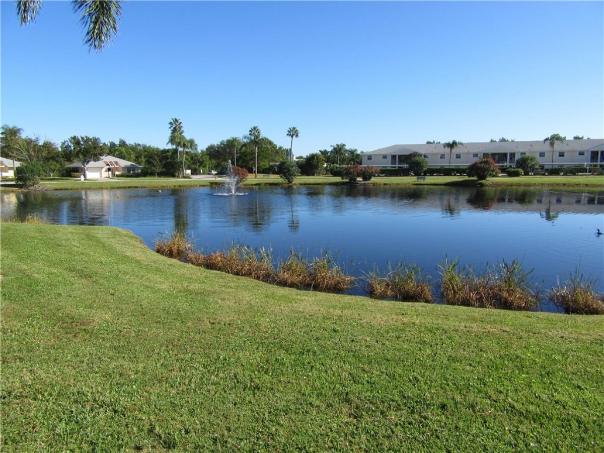 FIRST FLOOR! Incredible lake view facing east, offered turnkey...this one has it all. Accordion storm shutters on all openings! Lovely updated interior features tile and wood floors, granite, tile backsplash, cherry cabinets with pullouts! Both bathrooms remodeled, custom walk-in closet! Designer touches like crown molding, chair rail, custom shades. Newer stainless appliances, HVAC and W/H approx 4 years old. Large LG Thin Q washer/dryer. Active and financially responsible 55+ community boasts 2 pools/clubhouses, exercise facility, nature trail to river, kayak launch and guarded entrance!