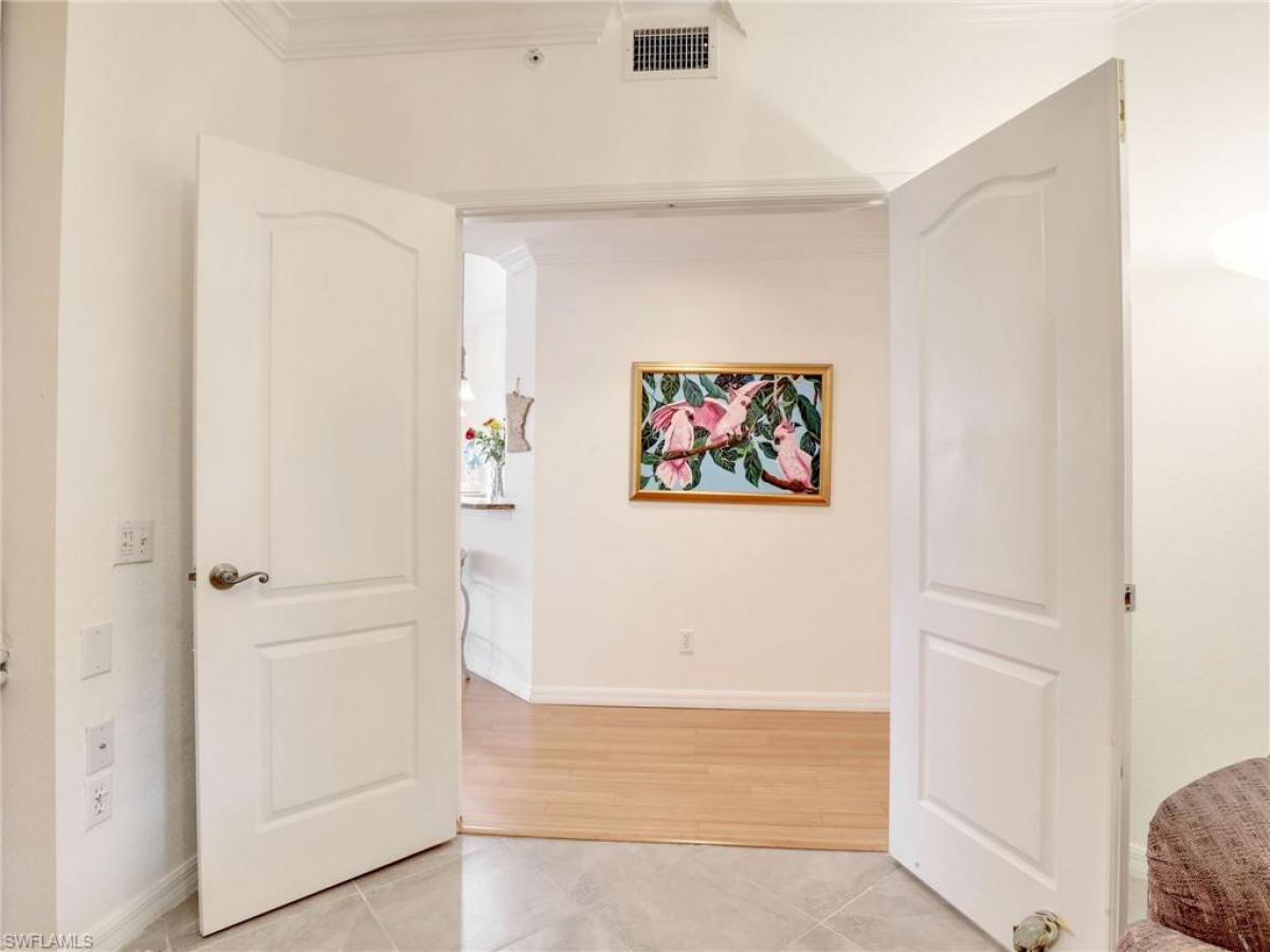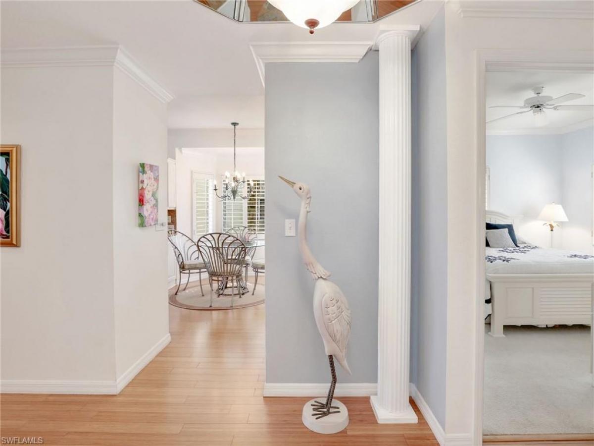 3bd 2 ba end unit condo, with a beautiful lake view. Condo has been tastefully redone, FEATURES BAMBOO WOOD FLOORS WITH CROWN MOLDING throughout. Kitchen has stainless appliances and a dining area .Built-in Cabinets in 3rd bedroom . Guest bath totally redone 1 year ago, tile floors, quartz countertops, shower and tub have new tiles, primary bath redone beautiful tiles and siletone countertops. Attached single-car garage close to elevator and large oversize lanai. Pebble creek has an island with 2 pools, gazebo, sauna spa, barbecues, clubhouse and a workout room. Pelican Bay has 3 miles of beach, access with trams or walk through the mangroves to the beach. Beach restaurants, attendants on the beach, tennis, pickleball. bocce, and attended fitness center.