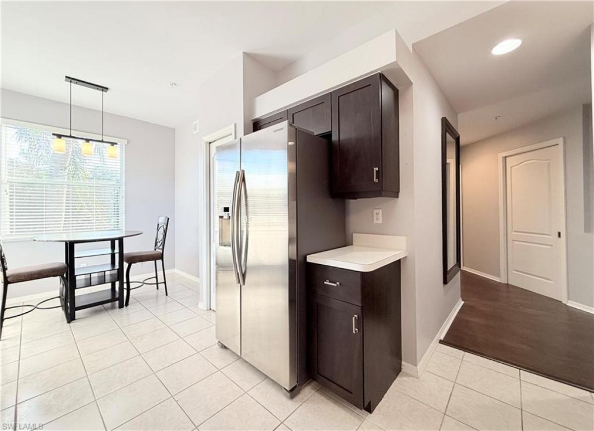 End unit 2 Bedroom + Den Condo - Highly sought after floor plan is now available! Golf Included. 3rd Floor end unit with NO ONE living above!!! Condo being sold turnkey. Building has common elevator. Upon entry you will notice the beautiful laminate plank flooring at entry and in dining room, living room, den and bedrooms. Kitchen and bathrooms have tile floors. Large Kitchen has updated shaker style cabinets, pantry and eat in area. Dining area is open to living room. Extra den is multi purpose room - can also be used as office or 3rd bedroom when needed (closes off with pocket doors for privacy). Spacious primary bedroom- looks out over water, golf and preserve, has 2 walk in closets and is split from guest bedroom for added privacy. Primary bath has walk in shower and linen closet. Guest Bedroom has walk in closet. Guest bath has tub/shower combo. Side windows in kitchen and living room allow for extra natural light. NO noise from above ... NO unit directly above. Back lanai has gorgeous view Hole 12 - Par 3. Back lanai is screen in of back and side for open feel. Electric hurricane shutters provide storm protection. A rare, very large common area separates space between buildings providing light and additional privacy. Back exposure allows you to enjoy your back lanai without it getting too much Florida sun. Condo has deeded storage room. Condo is a very short stroll to satellite pool. You will greatly appreciate that this condo is located within walking distance to the clubhouse!! Naples Heritage is a beautifully landscaped, gated, bundled golf community. Enjoy the NH lifestyle- 18 hole golf course, putting green, driving range, renovated clubhouse w/pro shop, resort style pool, tennis courts, pickleball courts, bocce, fitness center, poolside cabana & bar. Just minutes from downtown 5th Ave & beaches. More than a home its a Lifestyle!!